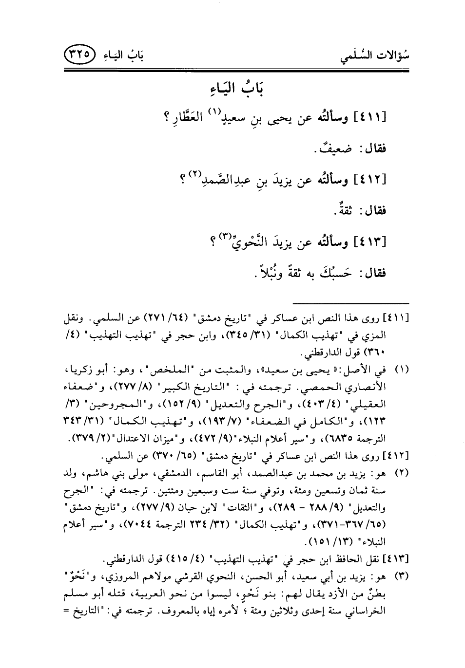 [411] روى هذا النص ابن عساكر في "تاريخ دمشق" (64/271) عن السلمي. ونقل المزي في "تهذيب الكمال" (31/345) ، وابن حجر في "تهذيب التهذيب" (4/360) قول الدارقطني.