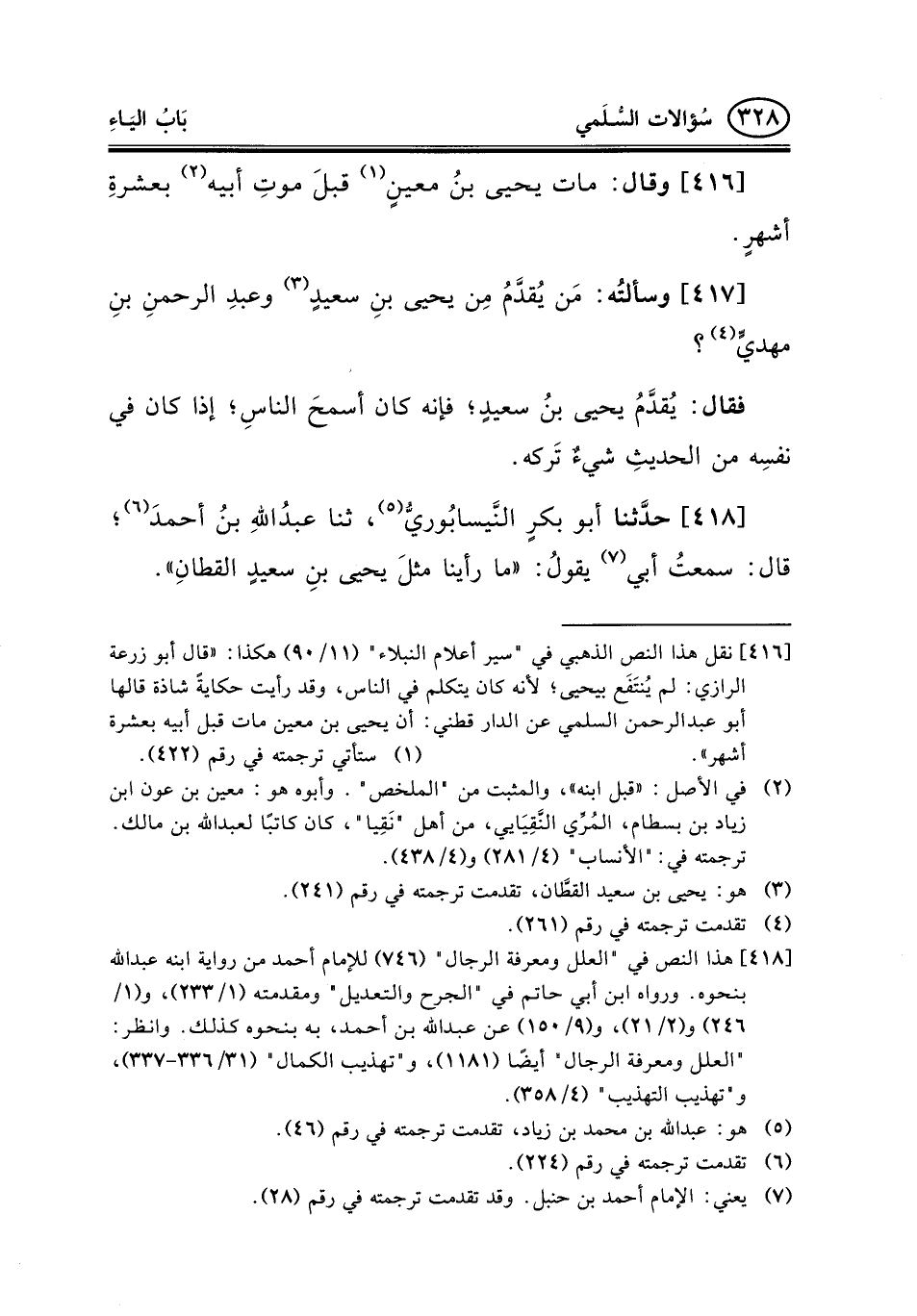 [416] نقل هذا النص الذهبي في "سير أعلام النبلاء" (11/90) هكذا: «قال أبو زرعة الرازي: لم يُنتَفَع بيحيى؛ لأنه كان يتكلم في الناس، وقد رأيت حكايةً شاذة قالها أبو عبد الرحمن السلمي عن الدارقطني: أن يحيى بن معين مات قبل أبيه بعشرة أشهر» .