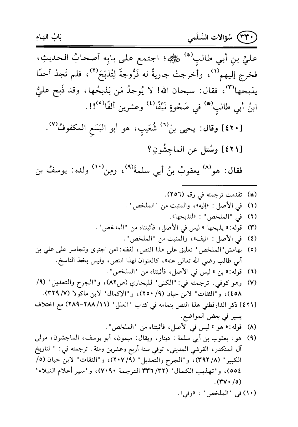 (¬5) بهامش"الملخص" تعليق على هذا النص، لفظه: «من اجترى وتجاسر على علي بن أبي طالب رضي الله تعالى عنه» ، كالعنوان لهذا النص، وليس بخط الناسخ.