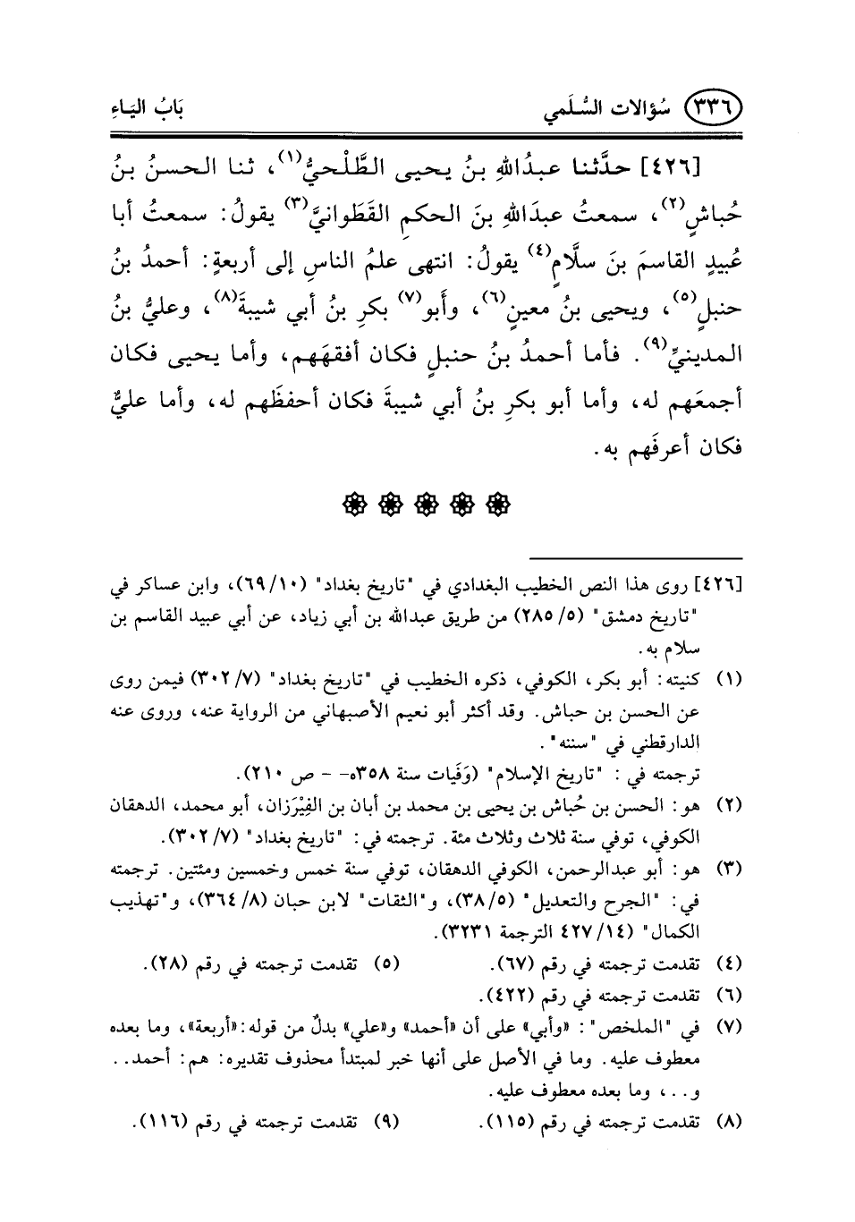 426 - حدَّثنا عبدُاللهِ بنُ يحيى الطَّلْحيُّ (¬1) ، ثنا الحسنُ بنُ حُباشٍ (¬2) ، سمعتُ عبدَاللهِ بنَ الحكمِ القَطَوانيَّ (¬3) يقولُ: سمعتُ أبا عُبيدٍ القاسمَ بنَ سلاَّمٍ (¬4) يقولُ: انتهى علمُ الناسِ إلى أربعةٍ: أحمدُ بنُ حنبلٍ (¬5) ، ويحيى بنُ معينٍ (¬6) ، وأَبو (¬7) بكرِ بنُ أبي شيبةَ (¬8) ، وعليُّ بنُ المدينيِّ (¬9) . فأما أحمدُ بنُ حنبلٍ فكان أفقهَهم، وأما يحيى فكان أجمعَهم له، وأما أبو بكرِ بنُ أبي شيبةَ فكان أحفظَهم له، وأما عليٌّ فكان أعرفَهم به.