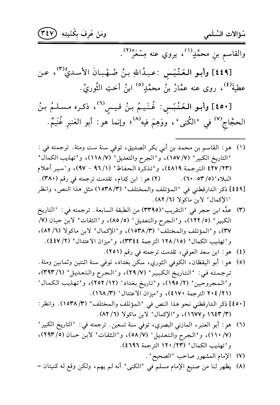450 - وأبو العَنْبَسِ: غُنَيمُ بنُ قيسٍ (¬6) ، ذكره مسلمُ بنُ الحجَّاجِ (¬7) في "الكُنى"، ووَهِمَ فيه (¬8) ؛ وإنما هو: أبو العَنبرِ غُنَيمٌ.