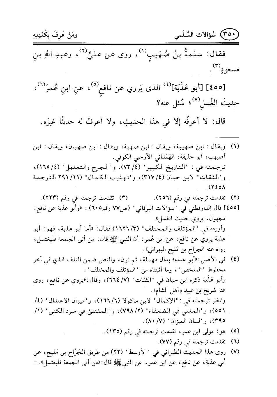 455 -[أبو عَذَبَة] (¬4) الذى يَروي عن نافعٍ (¬5) ، عنِ ابنِ عُمرَ (¬6) ، حديثَ الغُسلِ (¬7) ؛ سُئل عنه؟