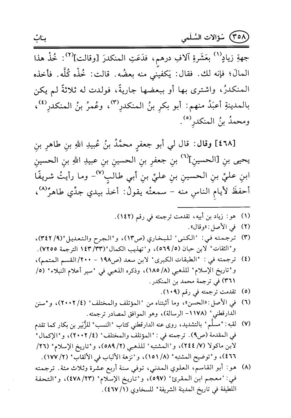 468 - وقال: قال لي أبو جعفرٍ محمَّدُ بنُ عُبيدِ اللهِ بنِ طاهرِ بنِ يحيى بنِ [الحسينِ] (¬6) بنِ جعفرِ بنِ الحسينِ بنِ عبيدِ اللهِ بنِ الحسينِ ابنِ عليِّ بنِ الحسينِ بنِ عليِّ بنِ أبي طالبٍ (¬7) - وما رأيتُ شريفًا أحفظَ لأيامِ الناسِ منه- سمعتُه يقولُ: أخذ بيدي جدِّي طاهرٌ (¬8) ،