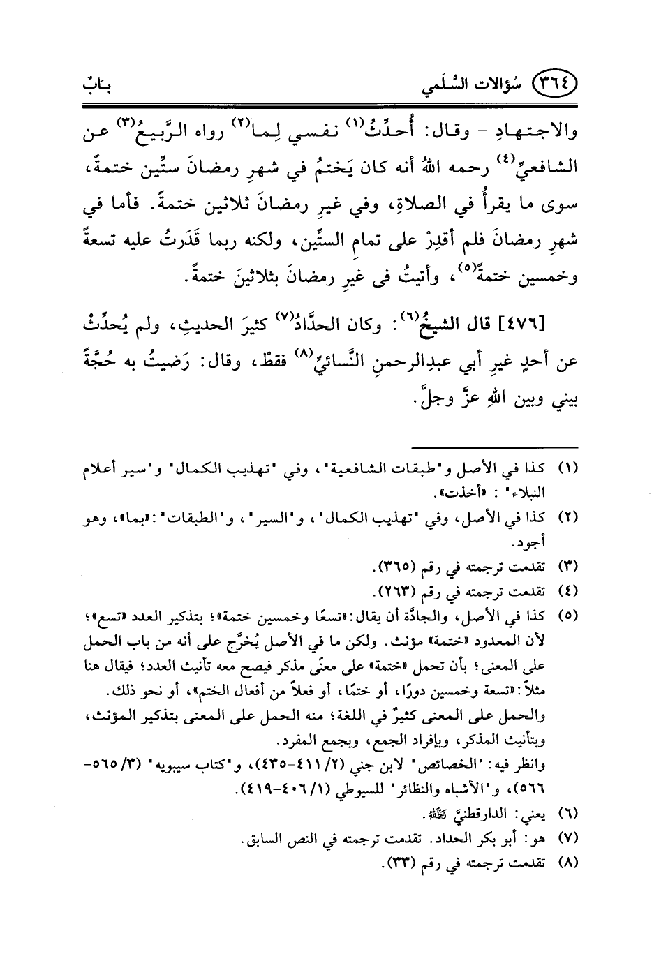 476 - قال الشيخُ (¬6) : وكان الحدَّادُ (¬7) كثيرَ الحديثِ، ولم يُحدِّثْ عن أحدٍ غيرِ أبي عبدِالرحمنِ النَّسائيِّ (¬8) فقطْ، وقال: رَضيتُ به حُجَّةً بيني وبين اللهِ عزَّ وجلَّ.