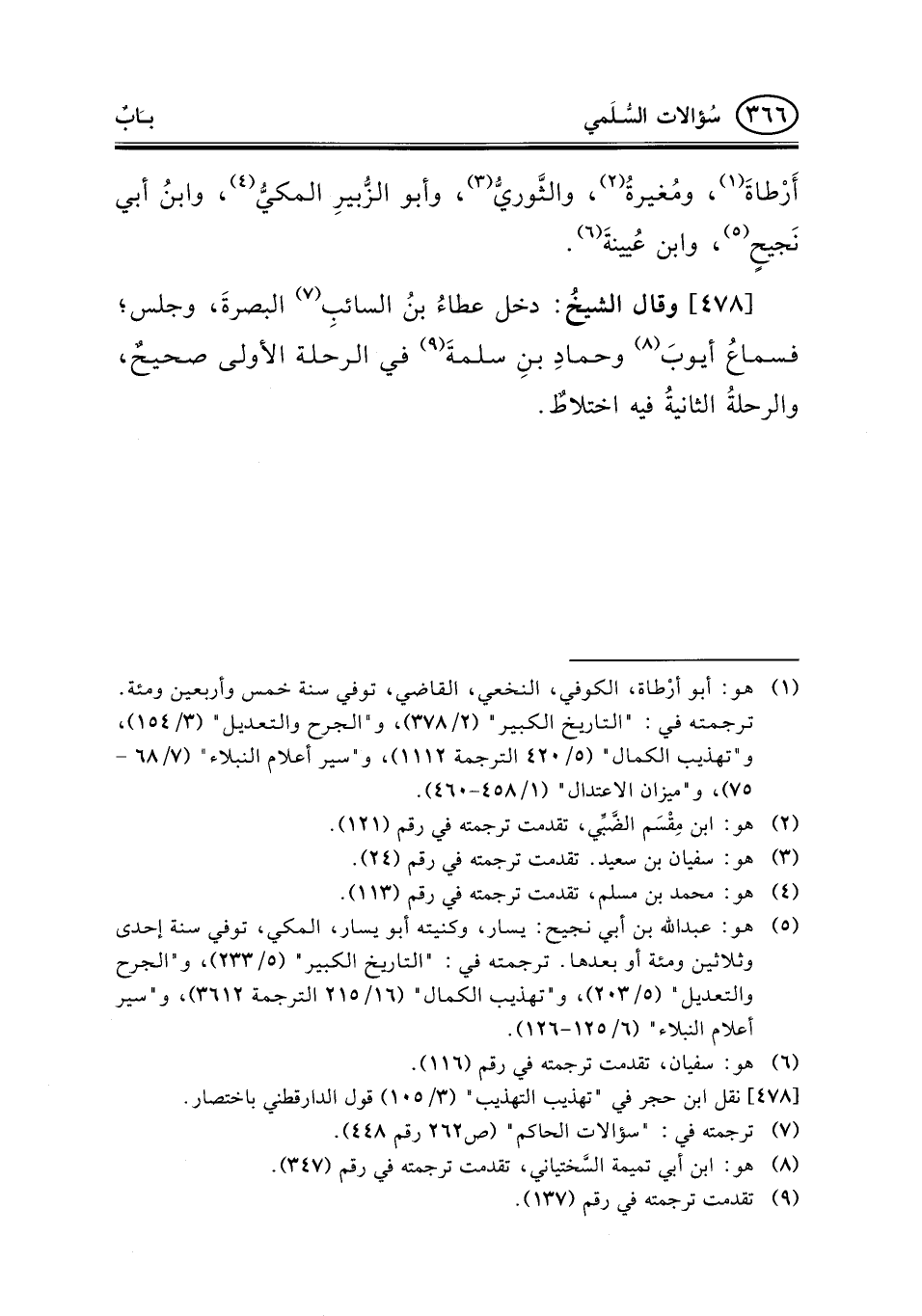 478 - وقال الشيخُ: دخل عطاءُ بنُ السائبِ (¬7) البصرةَ، وجلس؛ فسماعُ أيوبَ (¬8) وحمادِ بنِ سلمةَ (¬9) في الرحلة الأولى صحيحٌ، والرحلةُ الثانيةُ فيه اختلاطٌ.
