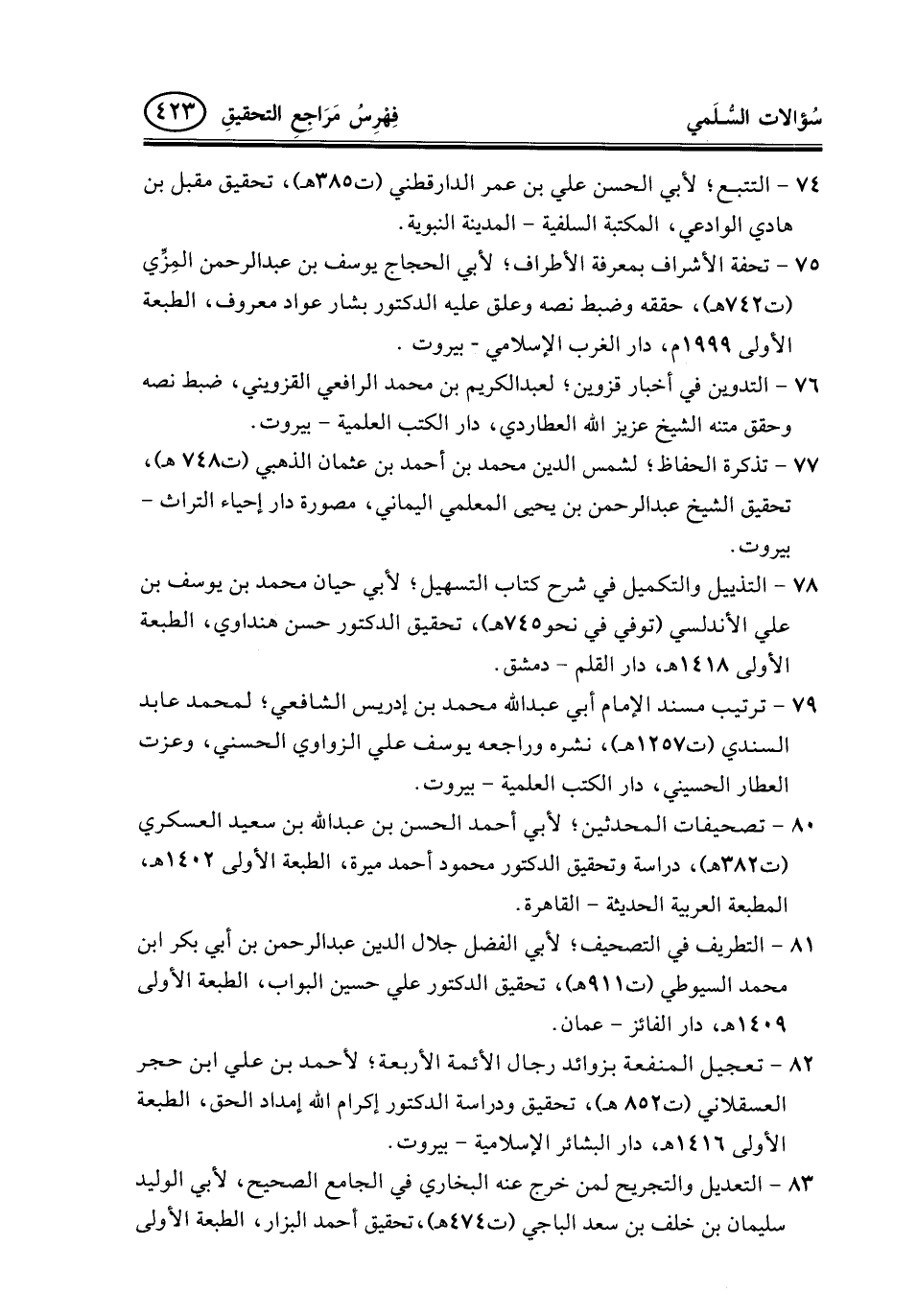 75- تحفة الأشراف بمعرفة الأطراف؛ لأبي الحجاج يوسف بن عبد الرحمن المِزِّي (ت742هـ) ، حققه وضبط نصه وعلق عليه الدكتور بشار عواد معروف، الطبعة الأولى 1999م، دار الغرب الإسلامي- بيروت.