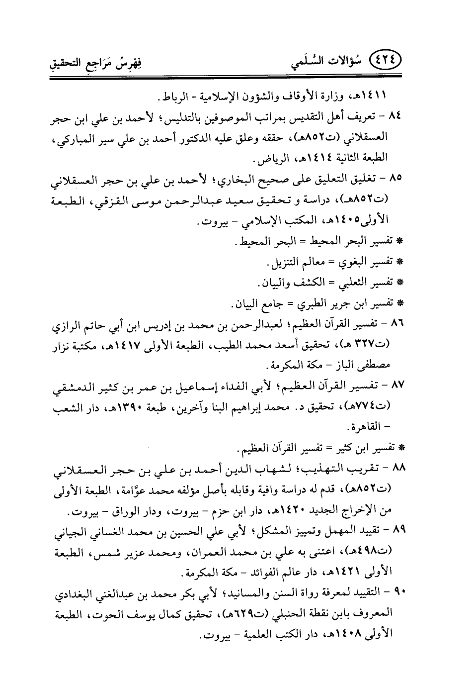 85- تغليق التعليق على صحيح البخاري؛ لأحمد بن علي بن حجر العسقلاني (ت852هـ) ، دراسة وتحقيق سعيد عبد الرحمن موسى القزقي، الطبعة الأولى1405هـ، المكتب الإسلامي- بيروت.