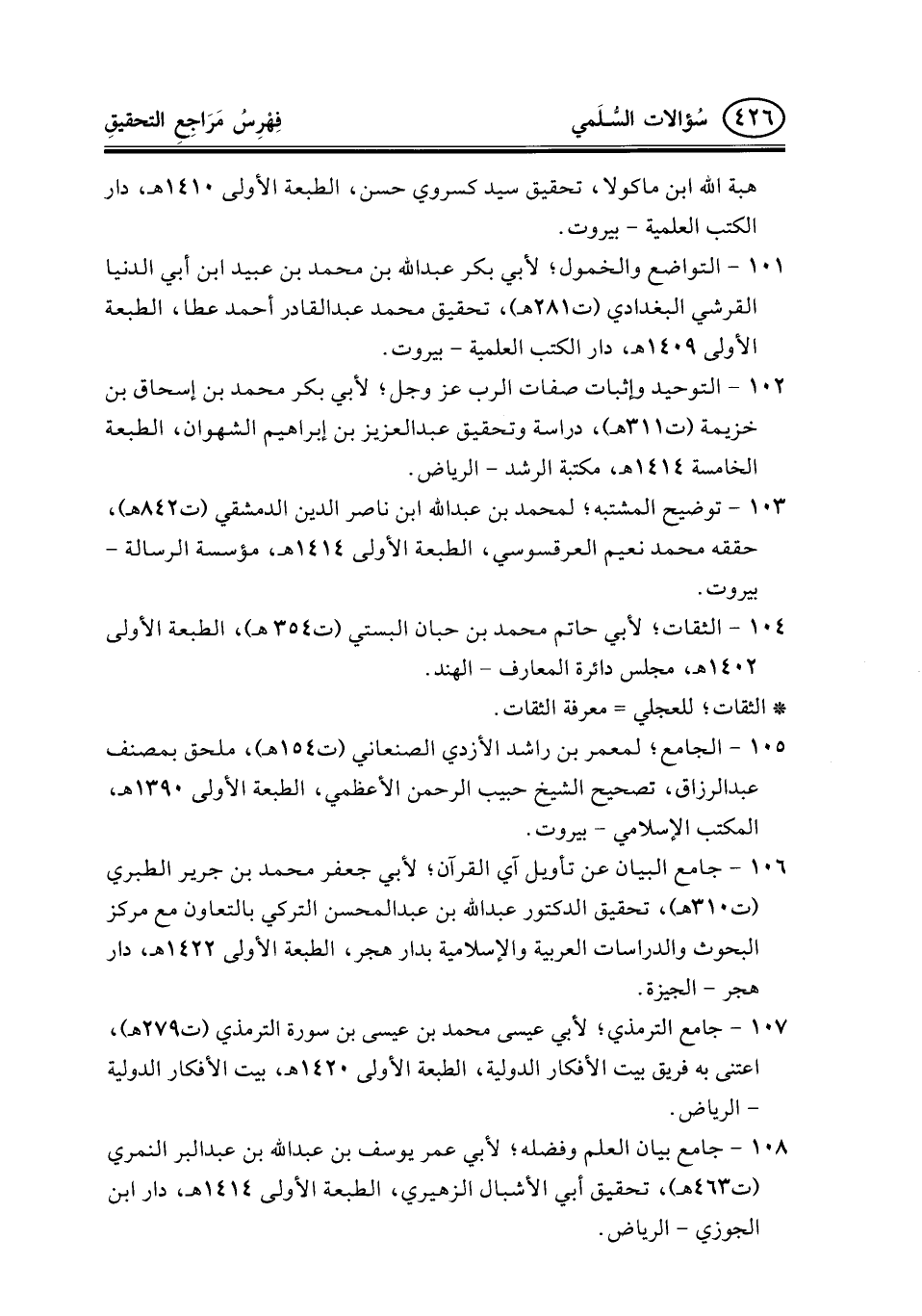 103- توضيح المشتبه؛ لمحمد بن عبد الله ابن ناصر الدين الدمشقي (ت842هـ) ، حققه محمد نعيم العرقسوسي، الطبعة الأولى 1414هـ، مؤسسة الرسالة- بيروت.