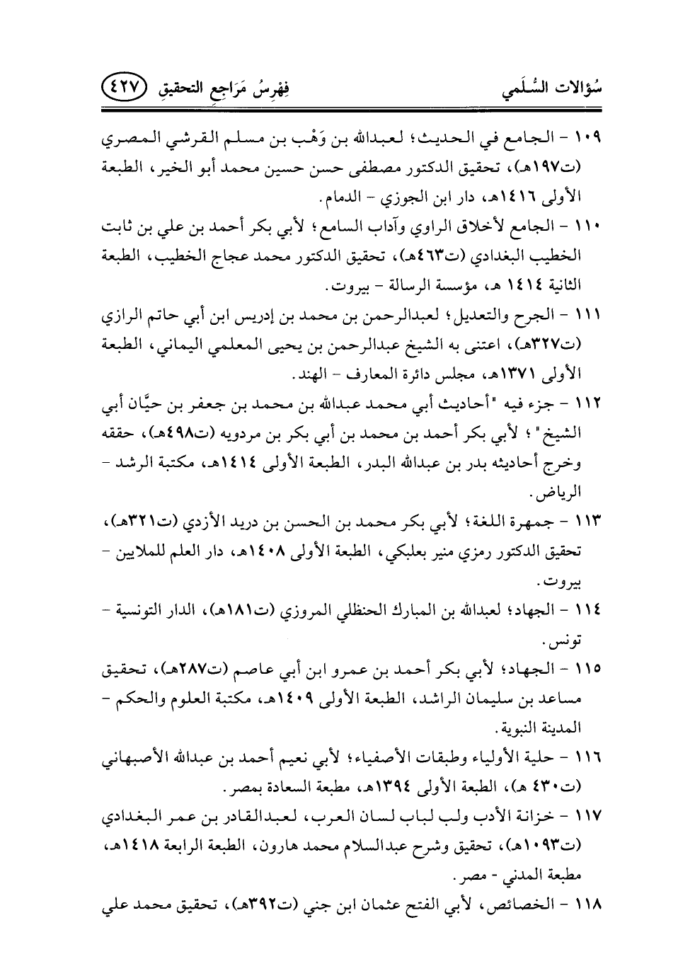 110- الجامع لأخلاق الراوي وآداب السامع؛ لأبي بكر أحمد بن علي بن ثابت الخطيب البغدادي (ت463هـ) ، تحقيق الدكتور محمد عجاج الخطيب، الطبعة الثانية 1414 هـ، مؤسسة الرسالة- بيروت.