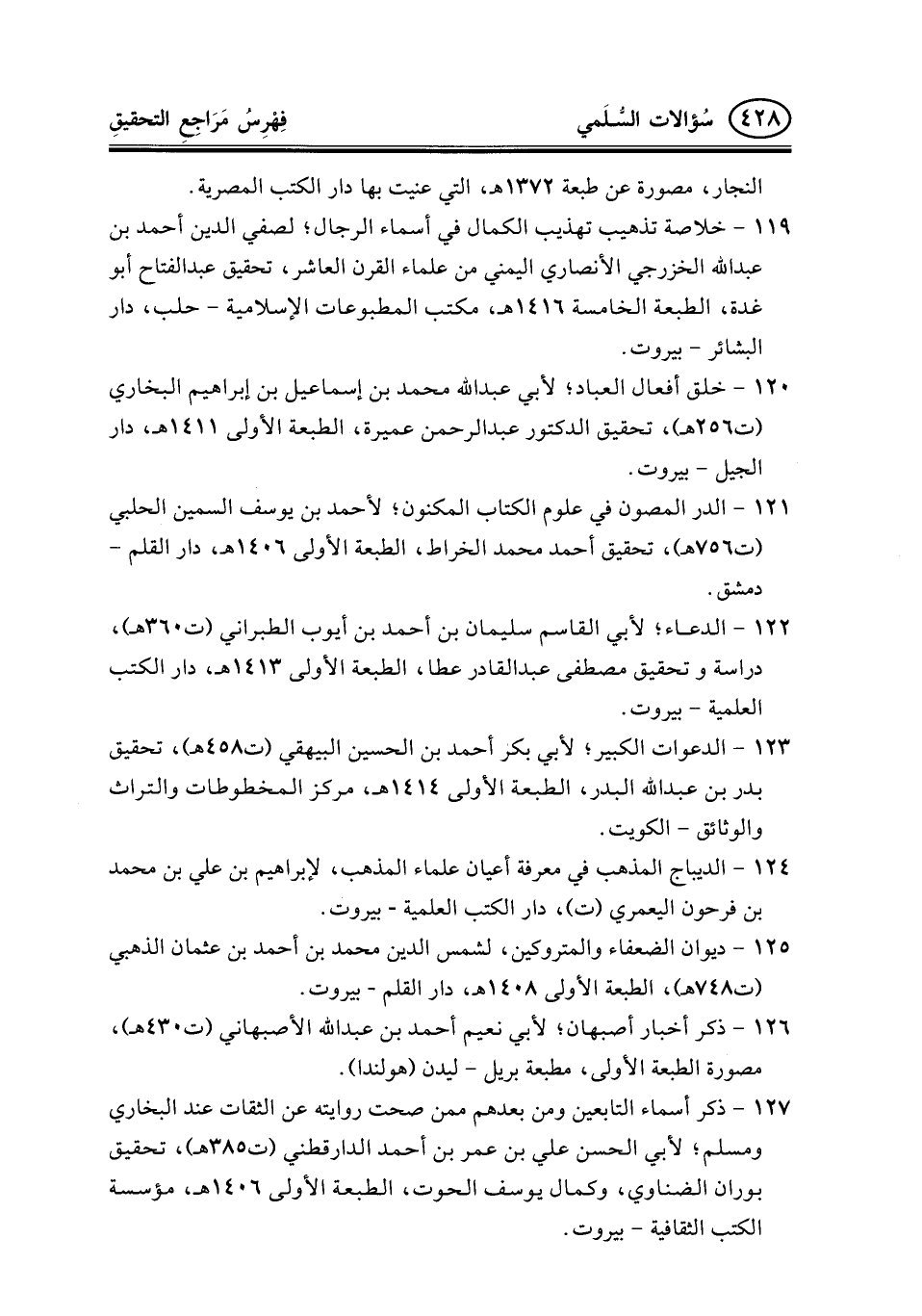 120- خلق أفعال العباد؛ لأبي عبد الله محمد بن إسماعيل بن إبراهيم البخاري (ت256هـ) ، تحقيق الدكتور عبد الرحمن عميرة، الطبعة الأولى 1411هـ، دار الجيل- بيروت.