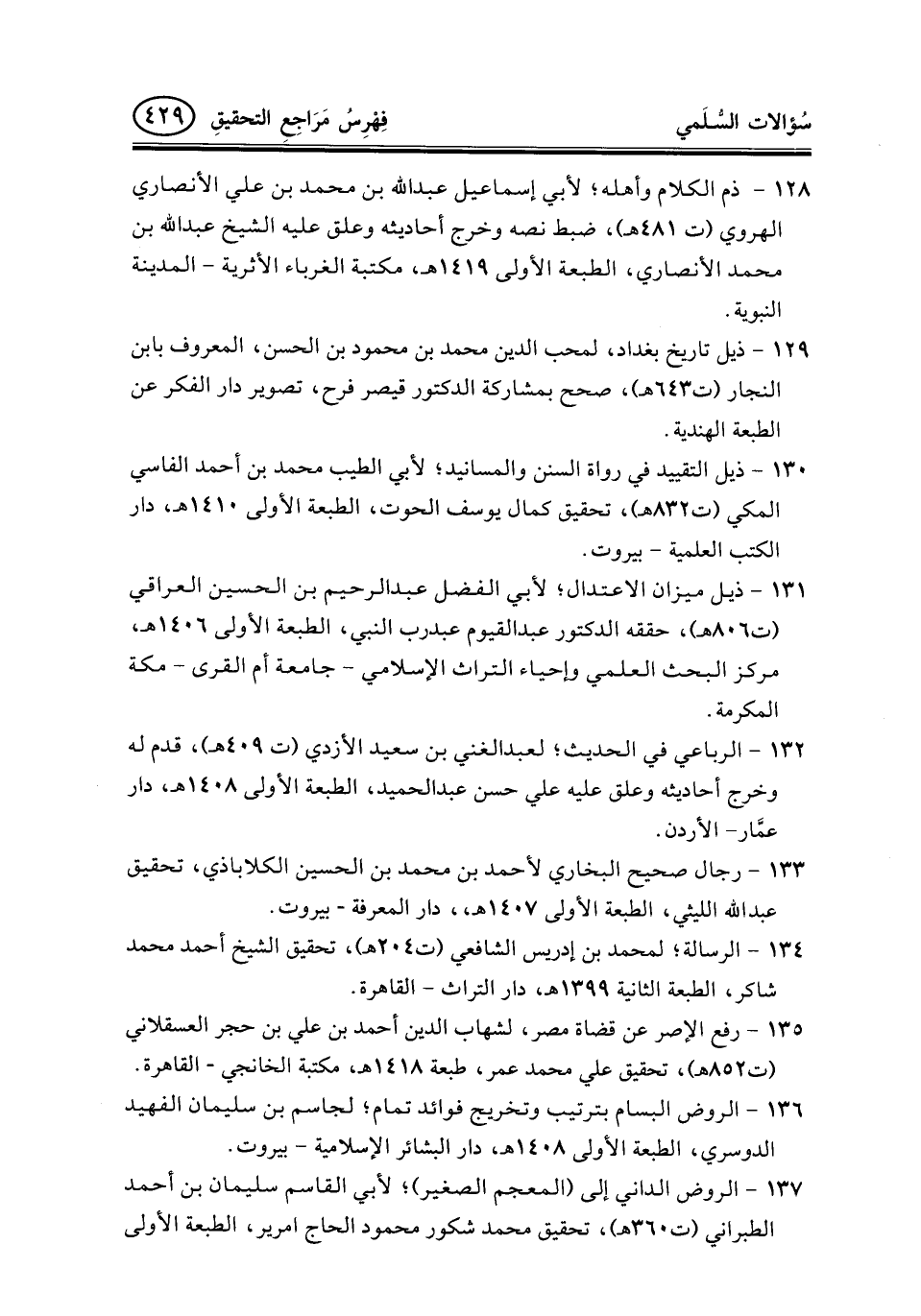 131- ذيل ميزان الاعتدال؛ لأبي الفضل عبد الرحيم بن الحسين العراقي (ت806هـ) ، حققه الدكتور عبد القيوم عبدرب النبي، الطبعة الأولى 1406هـ، مركز البحث العلمي وإحياء التراث الإسلامي- جامعة أم القرى- مكة المكرمة.