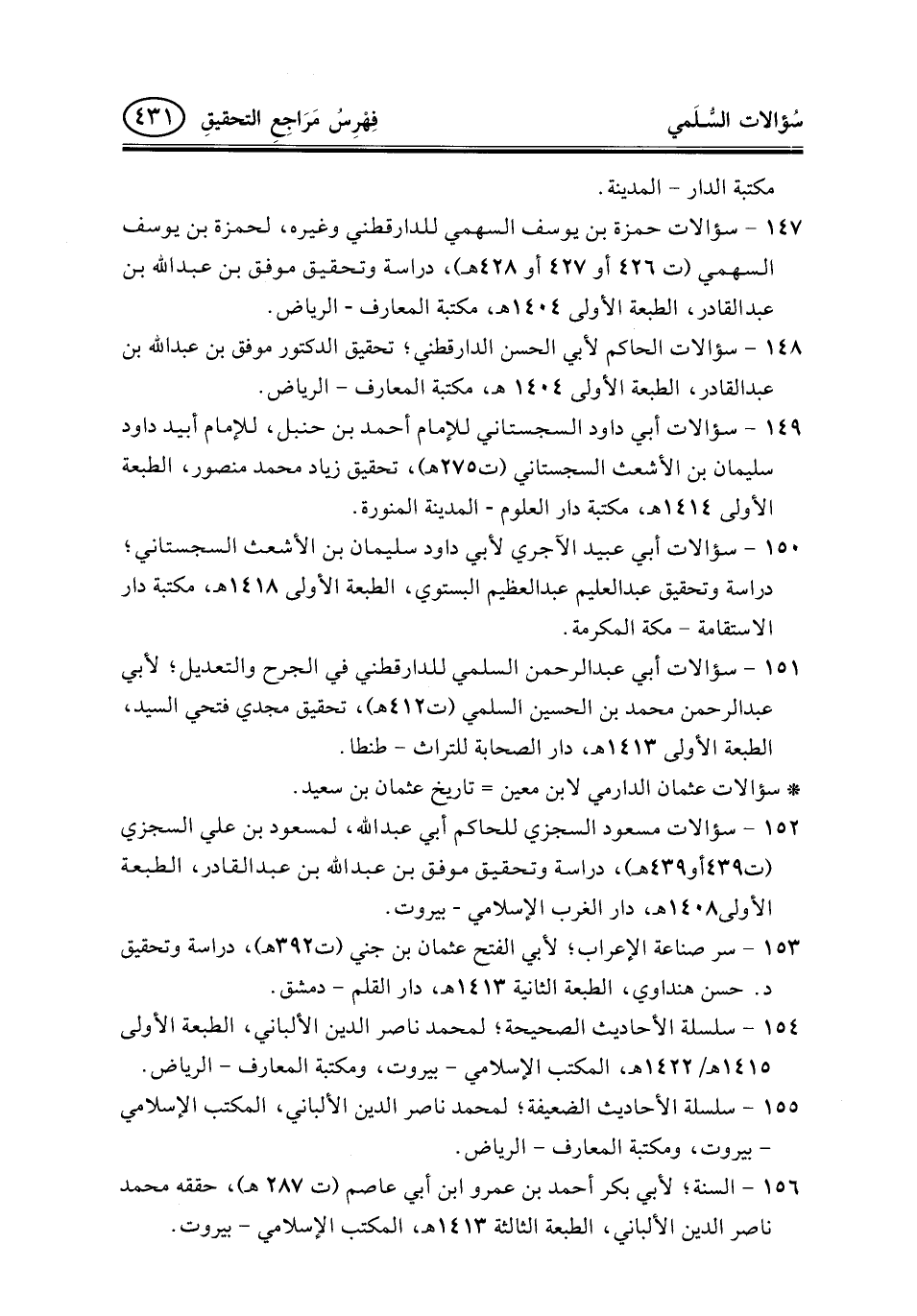 147- سؤالات حمزة بن يوسف السهمي للدارقطني وغيره، لحمزة بن يوسف السهمي (ت 426 أو 427 أو 428هـ) ، دراسة وتحقيق موفق بن عبد الله بن عبد القادر، الطبعة الأولى 1404هـ، مكتبة المعارف- الرياض.