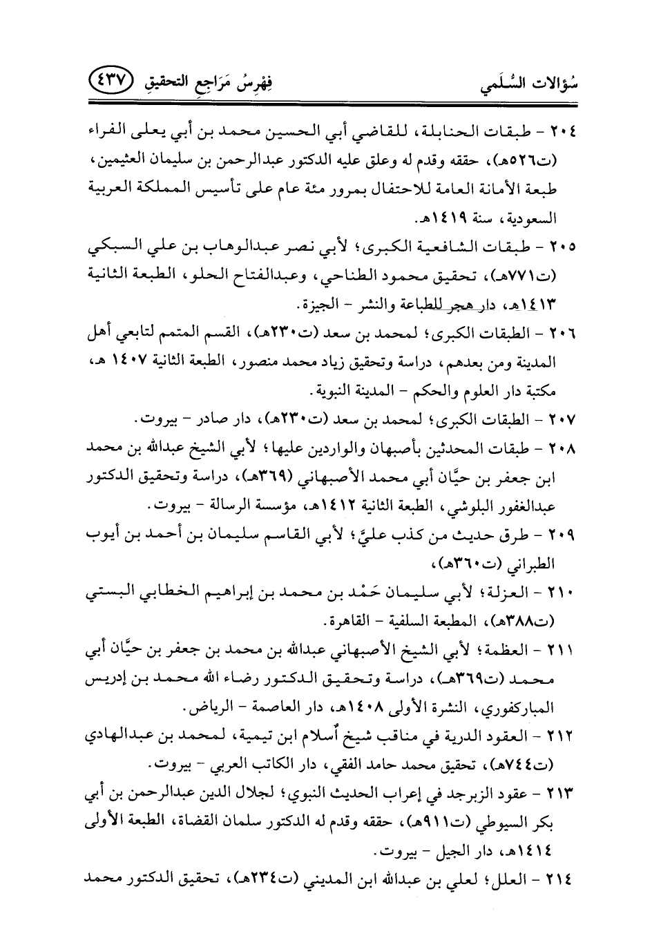 204- طبقات الحنابلة، للقاضي أبي الحسين محمد بن أبي يعلى الفراء (ت526هـ) ، حققه وقدم له وعلق عليه الدكتور عبد الرحمن بن سليمان العثيمين، طبعة الأمانة العامة للاحتفال بمرور مئة عام على تأسيس المملكة العربية السعودية، سنة 1419هـ.