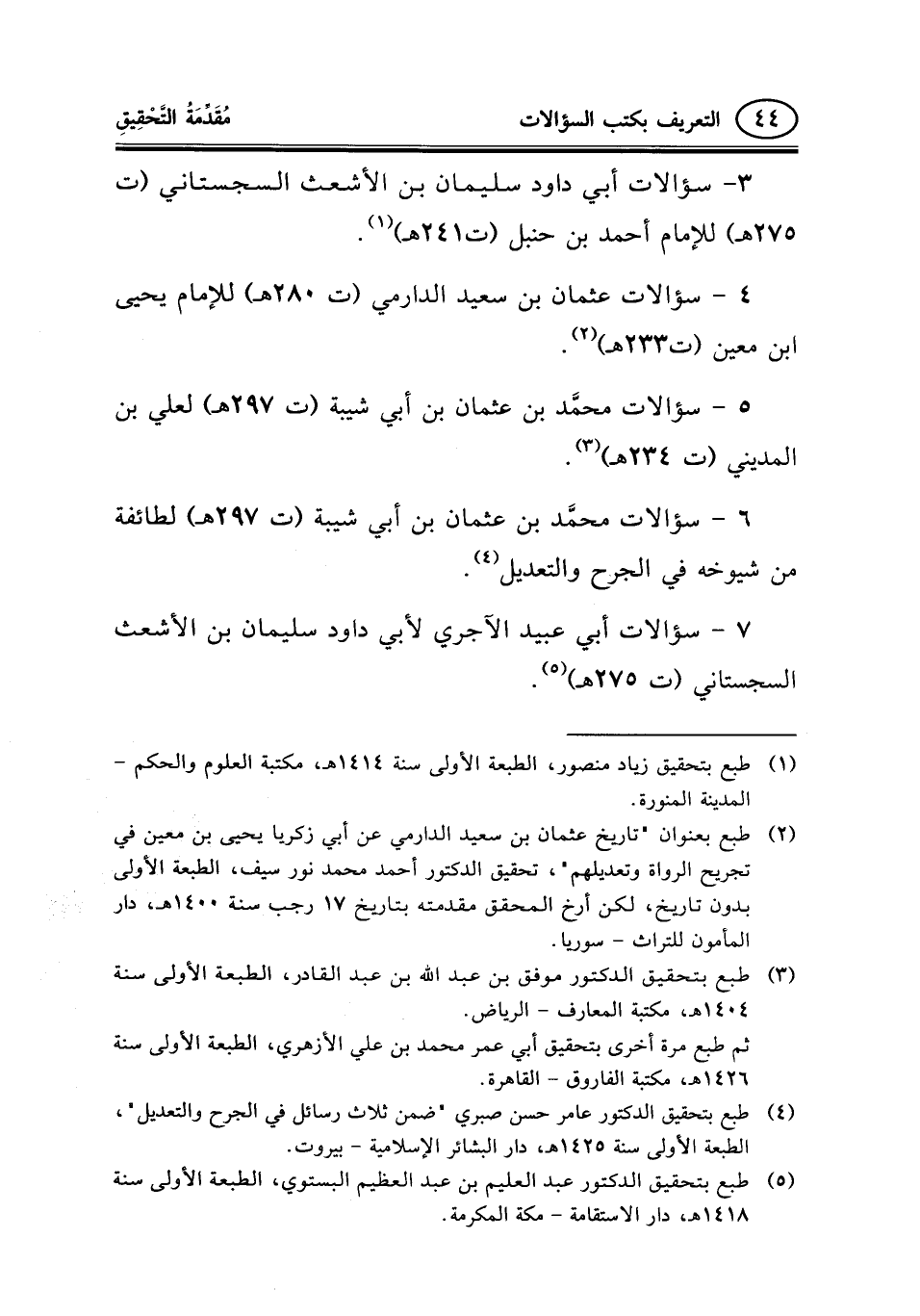 (¬4) طبع بتحقيق الدكتور عامر حسن صبري "ضمن ثلاث رسائل في الجرح والتعديل"، الطبعة الأولى سنة 1425هـ، دار البشائر الإسلامية- بيروت.