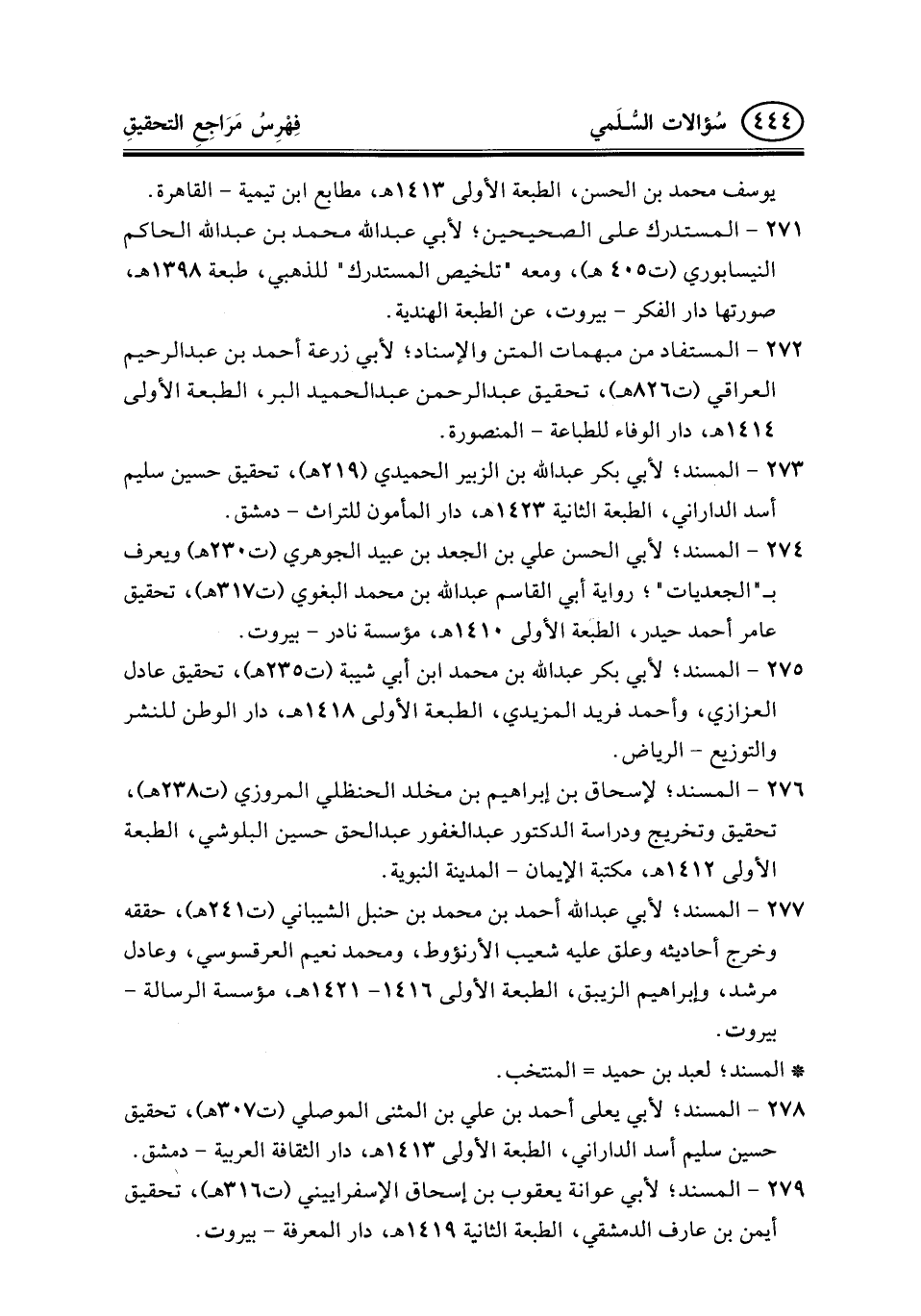 278- المسند؛ لأبي يعلى أحمد بن علي بن المثنى الموصلي (ت307هـ) ، تحقيق حسين سليم أسد الداراني، الطبعة الأولى 1413هـ، دار الثقافة العربية- دمشق.