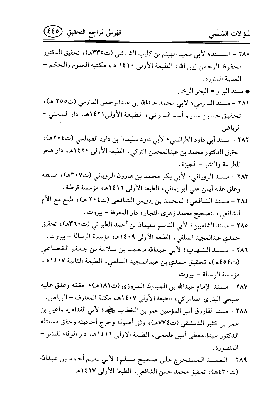 280- المسند؛ لأبي سعيد الهيثم بن كليب الشاشي (ت335هـ) ، تحقيق الدكتور محفوظ الرحمن زين الله، الطبعة الأولى 1410 هـ، مكتبة العلوم والحكم- المدينة المنورة.