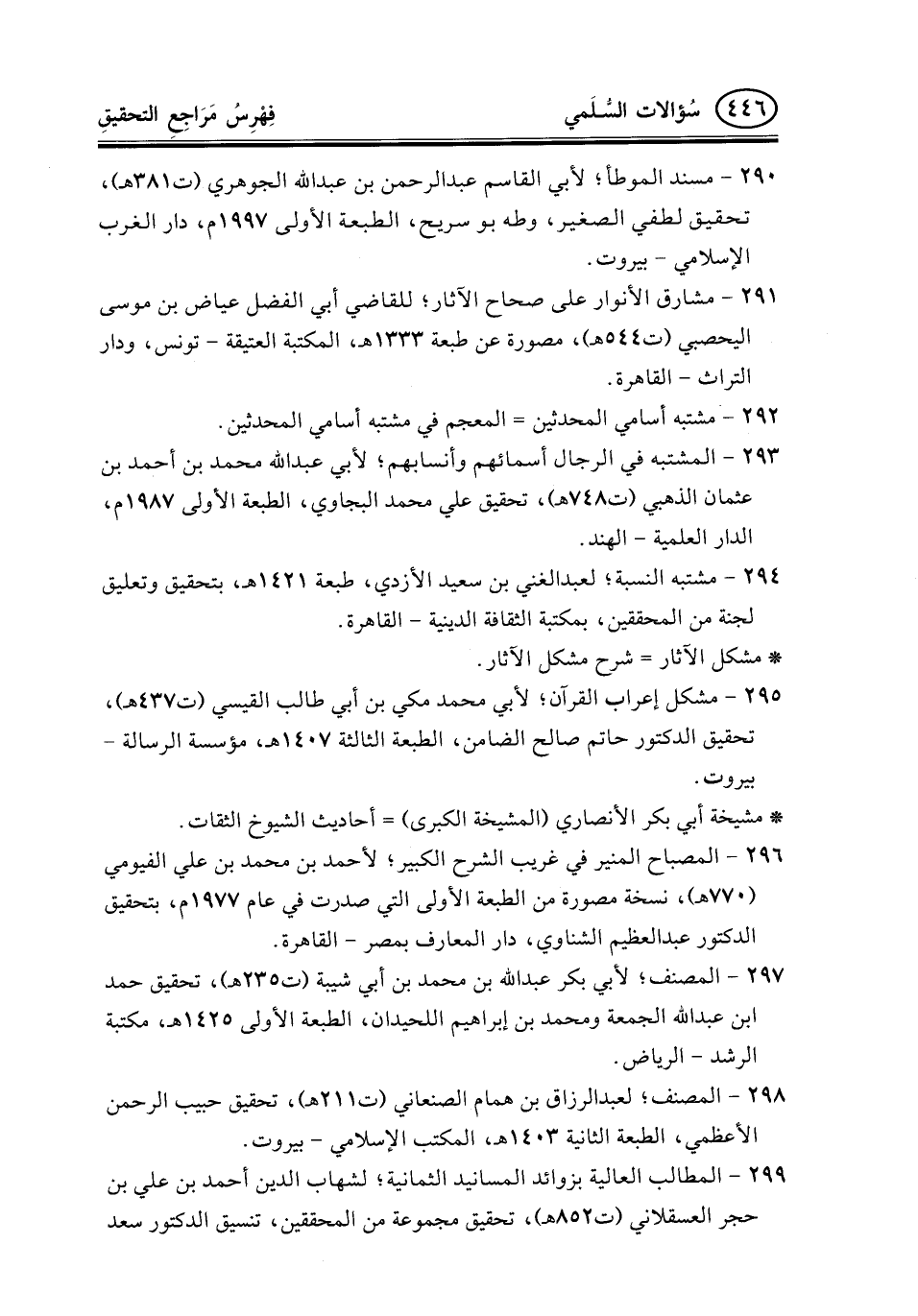 290- مسند الموطأ؛ لأبي القاسم عبد الرحمن بن عبد الله الجوهري (ت381هـ) ، تحقيق لطفي الصغير، وطه بو سريح، الطبعة الأولى 1997م، دار الغرب الإسلامي- بيروت.
