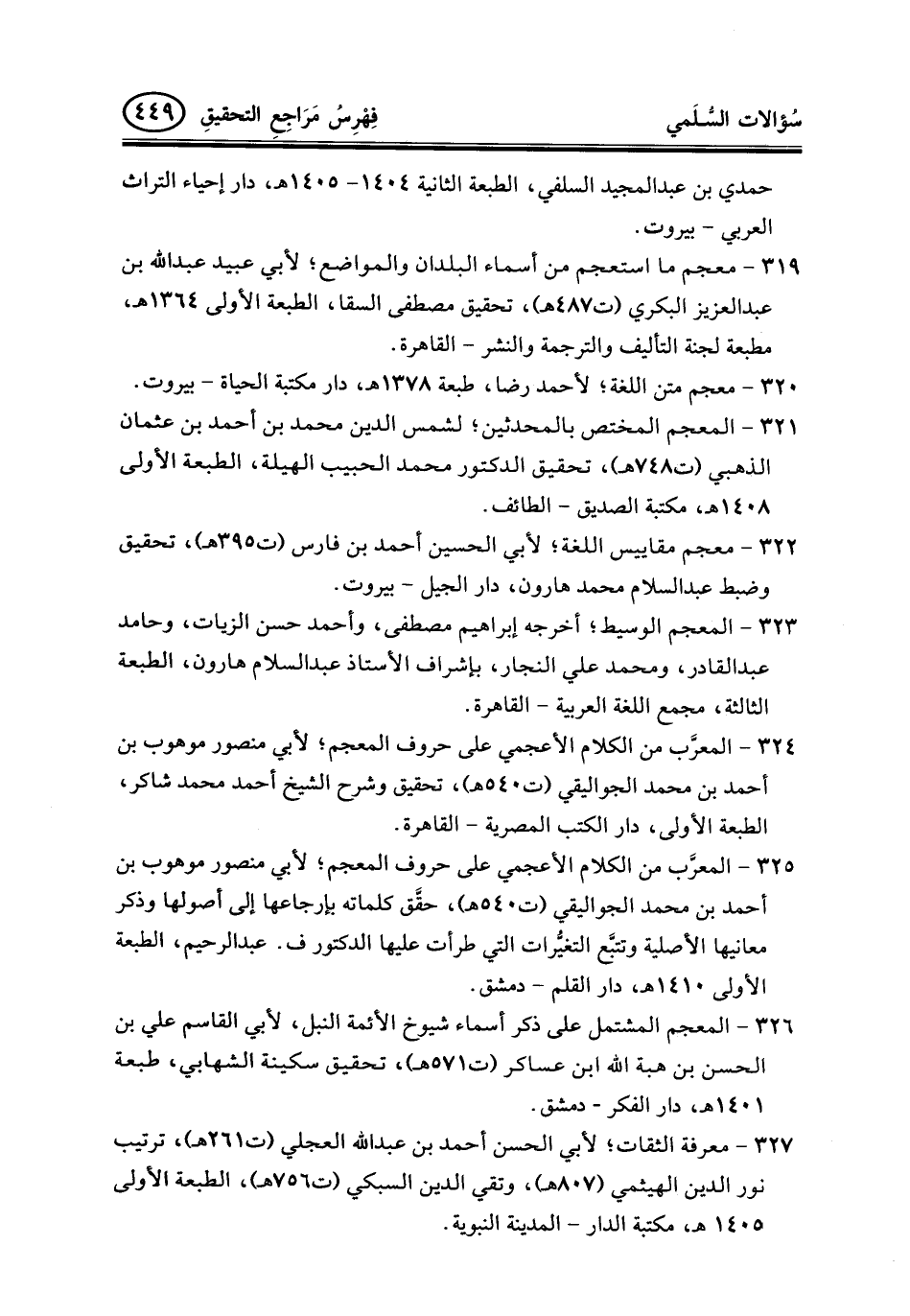 325- المعرَّب من الكلام الأعجمي على حروف المعجم؛ لأبي منصور موهوب بن أحمد بن محمد الجواليقي (ت540هـ) ، حقَّق كلماته بإرجاعها إلى أصولها وذكر معانيها الأصلية وتتبَّع التغيُّرات التي طرأت عليها الدكتور ف. عبد الرحيم، الطبعة الأولى 1410هـ، دار القلم- دمشق.