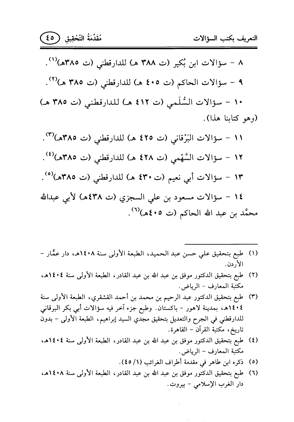 (¬3) طبع بتحقيق الدكتور عبد الرحيم بن محمد بن أحمد القشقري، الطبعة الأولى سنة 1404هـ، بمدينة لاهور- باكستان. وطبع جزء آخر فيه سؤالات أبي بكر البرقاني للدارقطني في الجرح والتعديل بتحقيق مجدي السيد إبراهيم، الطبعة الأولى- بدون تاريخ، مكتبة القرآن- القاهرة.