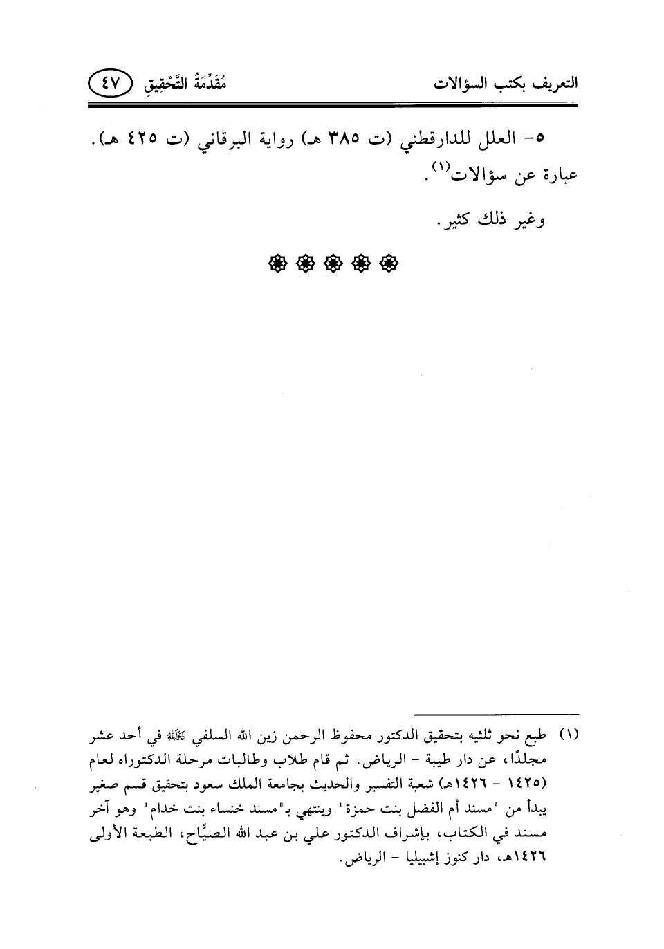 5- العلل للدارقطني (ت 385 هـ) رواية البرقاني (ت 425 هـ) . عبارة عن سؤالات (¬1) .