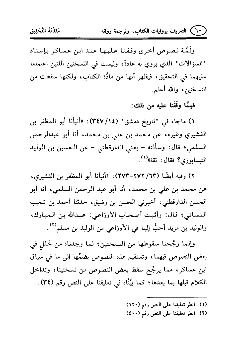 وإنما رجَّحنا سقوطها من النسختين؛ لما وجدناه من خَللٍ في بعض النصوص فيهما، وتستقيم هذه النصوص بضمِّها إلى ما في سياق ابن عساكر، مما يرجِّح سقطَ بعض النصوص من نسختينا، وتداخل الكلام قبلها بما بعدها؛ كما بيَّنَّاه في تعليقنا على النص رقم (34) .