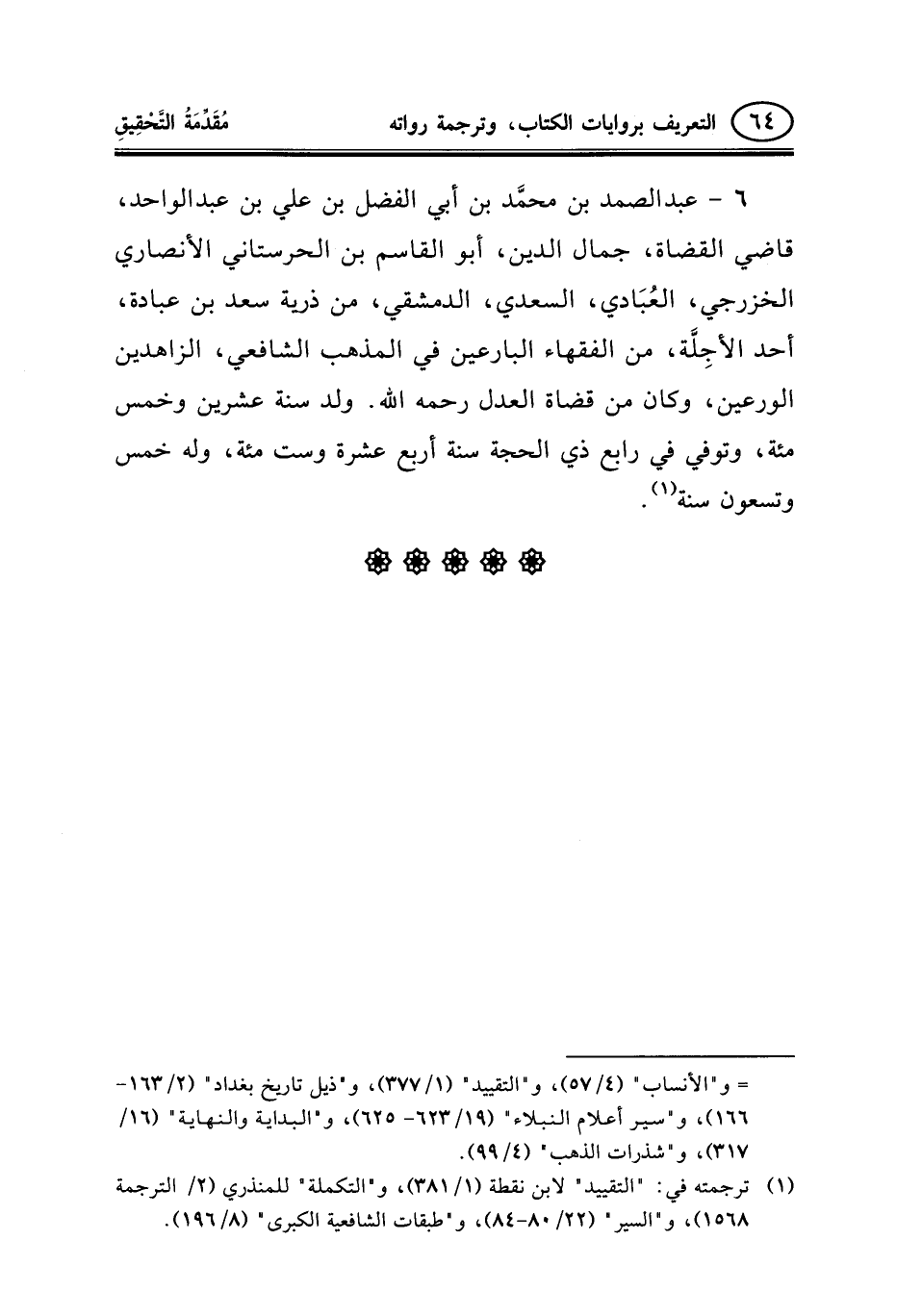 6- عبد الصمد بن محمَّد بن أبي الفضل بن علي بن عبد الواحد، قاضي القضاة، جمال الدين، أبو القاسم بن الحرستاني الأنصاري الخزرجي، العُبَادي، السعدي، الدمشقي، من ذرية سعد بن عبادة، أحد الأجِلَّة، من الفقهاء البارعين في المذهب الشافعي، الزاهدين الورعين، وكان من قضاة العدل رحمه الله. ولد سنة عشرين وخمس مئة، وتوفي في رابع ذي الحجة سنة أربع عشرة وست مئة، وله خمس وتسعون سنة (¬1) .