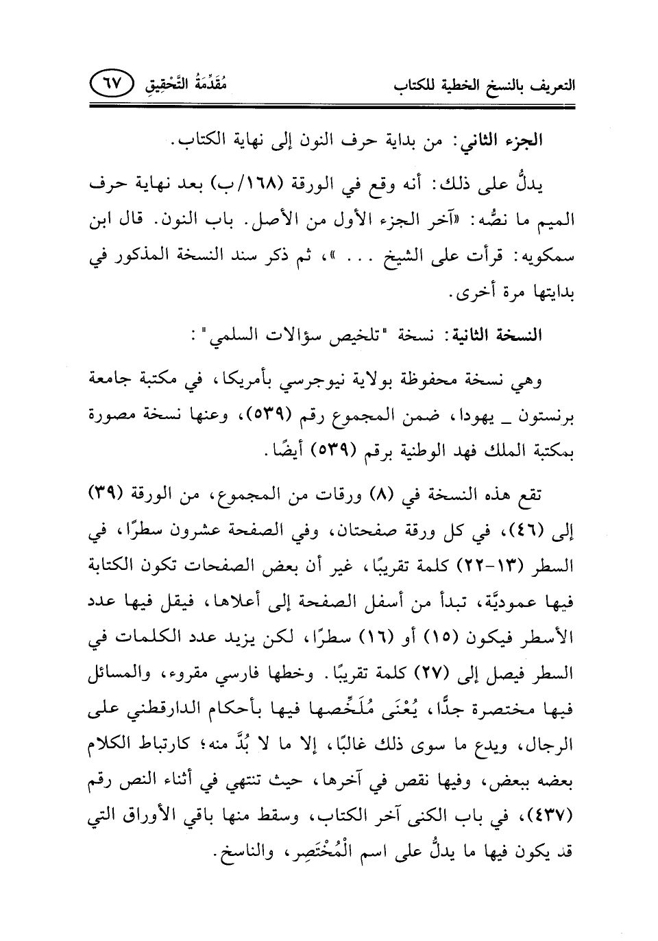 تقع هذه النسخة في (8) ورقات من المجموع، من الورقة (39) إلى (46) ، في كل ورقة صفحتان، وفي الصفحة عشرون سطرًا، في السطر (13-22) كلمة تقريبًا، غير أن بعض الصفحات تكون الكتابة فيها عموديَّة، تبدأ من أسفل الصفحة إلى أعلاها، فيقل فيها عدد الأسطر فيكون (15) أو (16) سطرًا، لكن يزيد عدد الكلمات في السطر فيصل إلى (27) كلمة تقريبًا. وخطها فارسي مقروء، والمسائل فيها مختصرة جدًّا، يُعْنَى مُلَخِّصها فيها بأحكام الدارقطني على الرجال، ويدع ما سوى ذلك غالبًا، إلا ما لا بُدَّ منه؛ كارتباط الكلام بعضه ببعض، وفيها نقص في آخرها، حيث تنتهي في أثناء النص رقم (437) ، في باب الكنى آخر الكتاب، وسقط منها باقي الأوراق التي قد يكون فيها ما يدلُّ على اسم الْمُخْتَصِر، والناسخ.