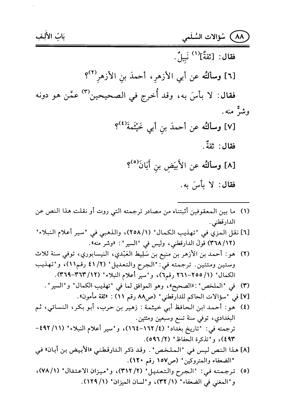 [7] في "سؤالات الحاكم للدارقطني" (ص88 رقم 11) : «ثقة مأمون» .