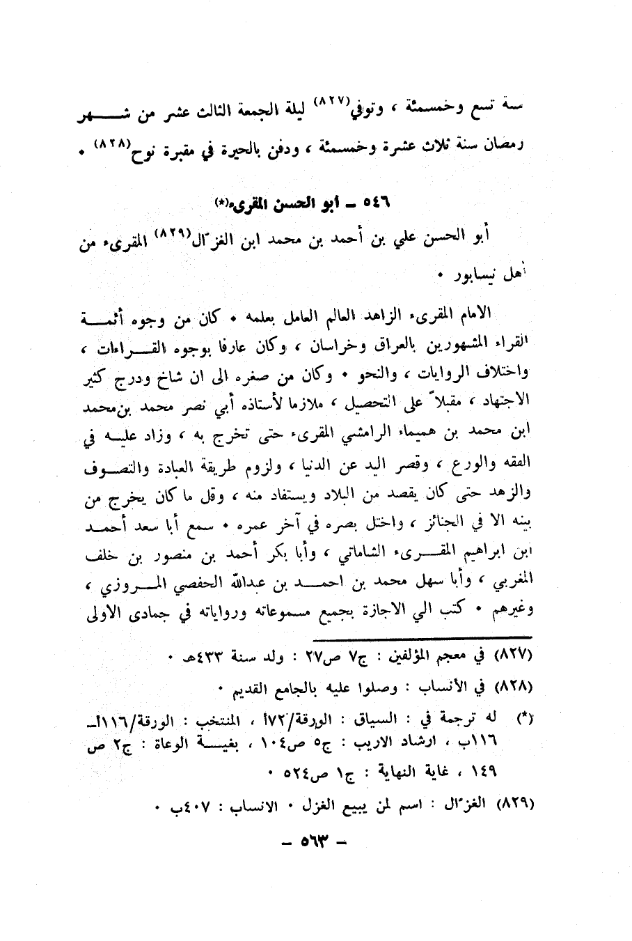 فأنكر علي وقال: ذاك يقرأ عليه الحديث؟ قلت: ولم، وهل هو إلا متشبع يرى رأي الحلبيين فقال: ليت أقتصر على هذا بل يقول بالنجوم، ويرى رأي الأوائل من المتفلسفين، وسمعت بعض أهل حلب أيضاً بدمشق يتهمه بمثل هذا، وكانت ولادته في المحرم سنة إحدى وستين وأربعمئة بحلب، ووفاته بها في سنة ست وأربعين وخمسمئة أو قريب منها، ذكره لي بعض أهل حلب ظناً.