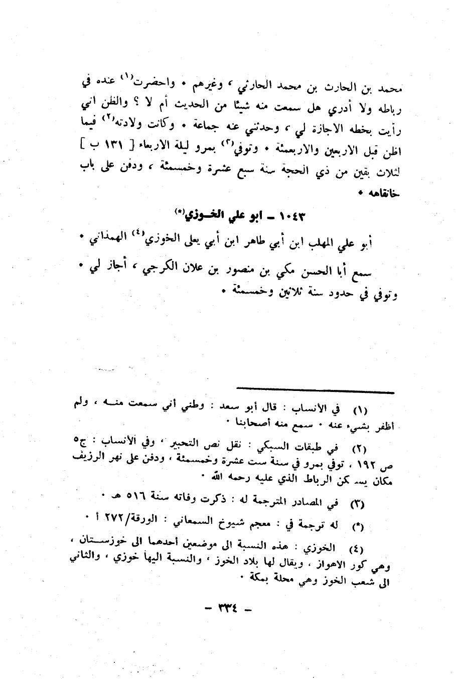 محمد بن الحارث بن محمد الحارثي، وغيرهم. وأحضرت عنده في رباطه ولا أدري هل سمعت منه شيئاً من الحديث أم لا؟ والظن أني رأيت بخطه الإجازة لي، وحدثني عنه جماعة. وكانت ولادته فيما أظن قبل الأربعين والأربعمئة. وتوفي بمرو ليلة الأربعاء لثلاث بقين من ذي الحجة سنة سبع عشرة وخمسمئة، ودفن على باب خانقاهه.