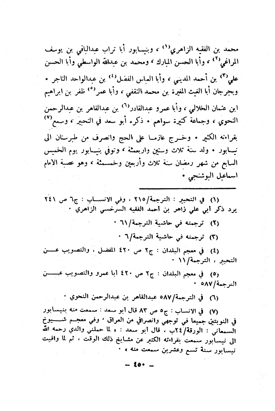 محمد بن الفقيه الزاهري، وبنيسابور أبا تراب عبد الباقي بن يوسف المراغي، وأبا الحسن المبارك، ومحمد بن عبد الله الواسطي وأبا الحسن علي بن أحمد المديني، وأبا العباس الفضل بن عبد الواحد التاجر. وبجرجان أبا الغيث المغيرة بن محمد الثقفي، وأبا عمر ظفر بن إبراهيم ابن عثمان الخلالي، وأبا عمرو عبد القادر بن عبد القاهر بن عبد الرحمن النحوي، وجماعة كثيرة سواهم. ذكره أبو سعد في التحبير، وسمع بقراءته الكثير. وخرج عازماً على الحج وانصرف من طبرستان إلى نيسابور. ولد سنة ثلاث وستين وأربعمئة، وتوفي بنيسابور يوم الخميس السابع من شهر رمضان سنة ثلاث وأربعين وخمسمئة، وهو عصبة الإمام إسماعيل البوشنجي