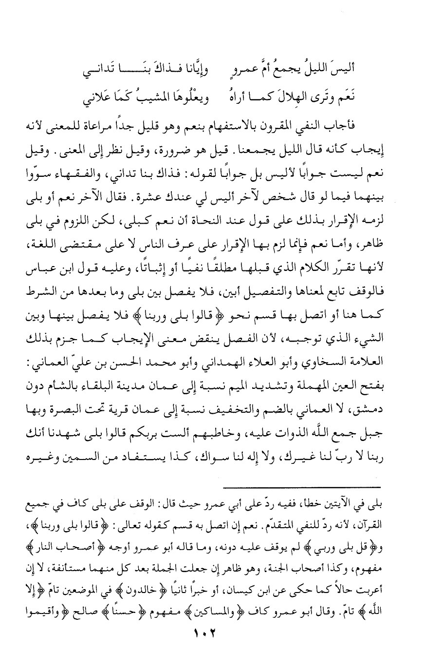 فأجاب النفي المقرون بالاستفهام بنعم وهو قليل جدا مراعاة للمعنى لأنه إيجاب كأنه قال الليل يجمعنا. قيل هو ضرورة، وقيل نظر إلى المعنى. وقيل نعم ليست جوابا لأ ليس بل جوابا لقوله: فذاك بنا تداني، والفقهاء سوّوا بينهما فيما لو قال شخص لآخر أليس لي عندك عشرة. فقال الآخر نعم أو بلى لزمه الإقرار بذلك على قول عند النحاة أن نعم كبلى، لكن اللزوم في بلى ظاهر، وأما نعم فإنما لزم بها الإقرار على عرف الناس لا على مقتضى اللغة، لأنها تقرّر الكلام الذي قبلها مطلقا نفيا أو إثباتا، وعليه قول ابن عباس فالوقف تابع لمعناها والتفصيل أبين، فلا يفصل بين بلى وما بعدها من الشرط كما هنا أو اتصل بها قسم نحو قالُوا بَلى وَرَبِّنا* فلا يفصل بينها وبين الشيء الذي توجبه، لأن الفصل ينقض معنى الإيجاب كما جزم بذلك العلامة السخاوي وأبو العلاء الهمداني وأبو محمد الحسن بن عليّ العماني:
