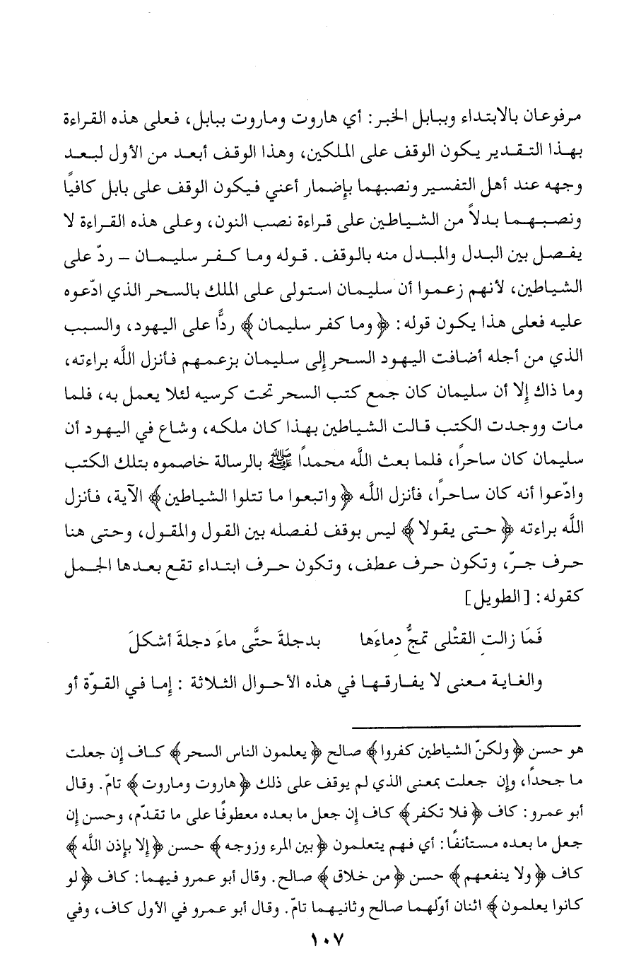 مرفوعان بالابتداء وببابل الخبر: أي هاروت وماروت ببابل، فعلى هذه القراءة بهذا التقدير يكون الوقف على الملكين، وهذا الوقف أبعد من الأول لبعد وجهه عند أهل التفسير ونصبهما بإضمار أعني فيكون الوقف على بابل كافيا ونصبهما بدلا من الشياطين على قراءة نصب النون، وعلى هذه القراءة لا يفصل بين البدل والمبدل منه بالوقف. قوله وما كفر سليمان- ردّ على الشياطين، لأنهم زعموا أن سليمان استولى على الملك بالسحر الذي ادّعوه عليه فعلى هذا يكون قوله: وَما كَفَرَ سُلَيْمانُ ردّا على اليهود، والسبب الذي من أجله أضافت اليهود السحر إلى سليمان بزعمهم فأنزل الله براءته، وما ذاك إلا أن سليمان كان جمع كتب السحر تحت كرسيه لئلا يعمل به، فلما مات ووجدت الكتب قالت الشياطين بهذا كان ملكه، وشاع في اليهود أن سليمان كان ساحرا، فلما بعث الله محمدا صلّى الله عليه وسلّم بالرسالة خاصموه بتلك الكتب وادّعوا أنه كان ساحرا، فأنزل الله وَاتَّبَعُوا ما تَتْلُوا الشَّياطِينُ الآية، فأنزل الله براءته حَتَّى يَقُولا ليس بوقف لفصله بين القول والمقول، وحتى هنا حرف جرّ، وتكون حرف عطف، وتكون حرف ابتداء تقع بعدها الجمل كقوله: [الطويل]