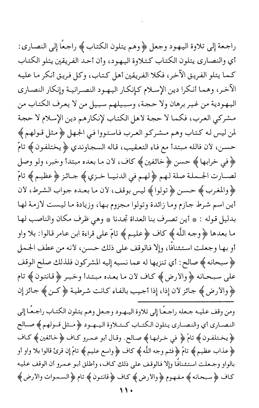 ومن وقف عليه جعله راجعا إلى تلاوة اليهود وجعل وهم يتلون الكتاب راجعا إلى النصارى أي والنصارى يتلون الكتاب كتلاوة اليهود مِثْلَ قَوْلِهِمْ صالح يَخْتَلِفُونَ تامّ فِي خَرابِها صالح. وقال أبو عمرو كاف خائِفِينَ كاف عَذابٌ عَظِيمٌ تامّ فَثَمَّ وَجْهُ اللَّهِ كاف واسِعٌ عَلِيمٌ تامّ إن قرئ قالوا بلا واو أو بالواو وجعلت استئنافا وإلا فالوقف على ذلك كاف، وأطلق أبو عمرو أن الوقف عليه كاف سُبْحانَهُ مفهوم وَالْأَرْضِ كاف قانِتُونَ تام السَّماواتِ وَالْأَرْضِ