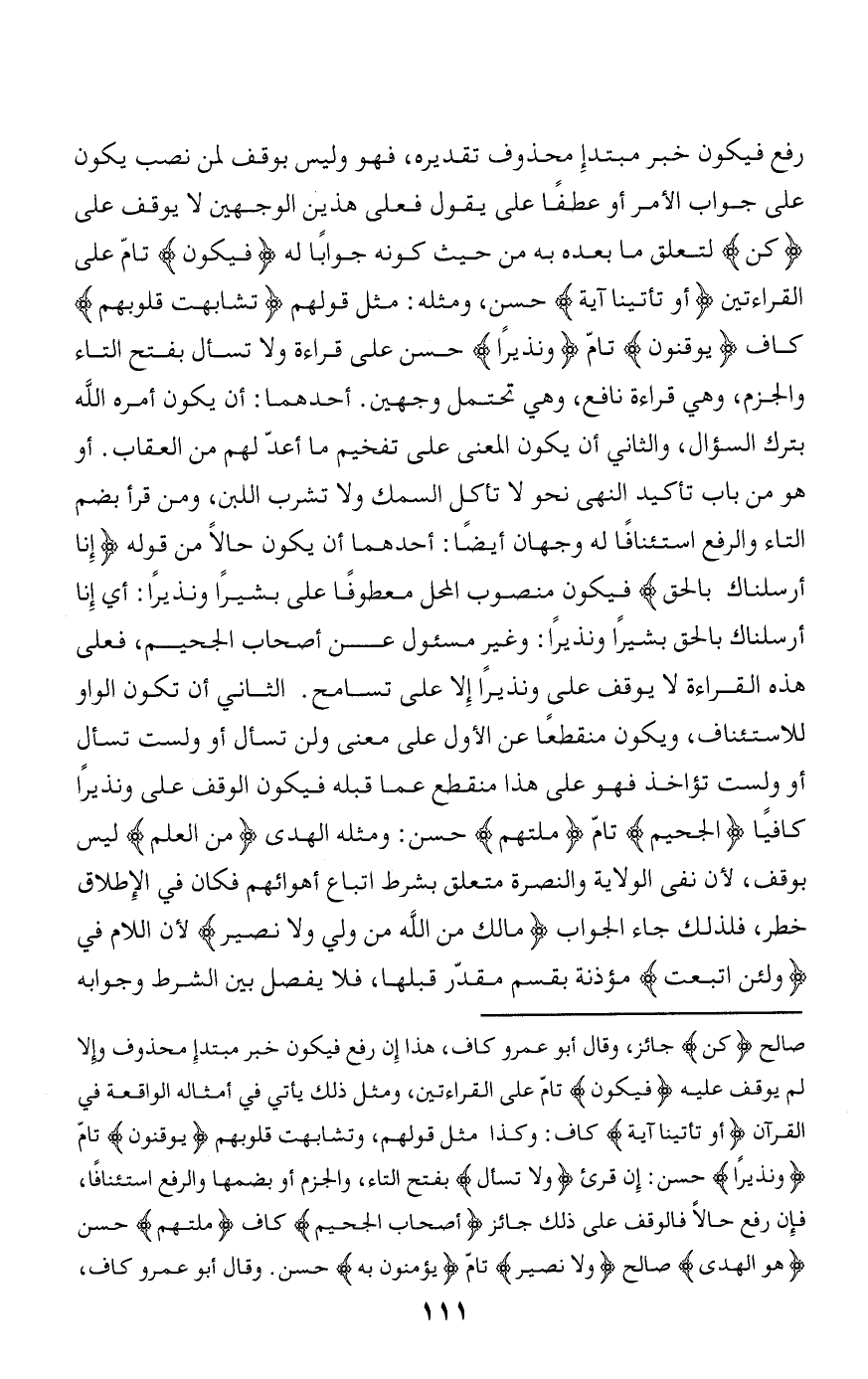 رفع فيكون خبر مبتدإ محذوف تقديره، فهو وليس بوقف لمن نصب يكون على جواب الأمر أو عطفا على يقول فعلى هذين الوجهين لا يوقف على كُنْ لتعلق ما بعده به من حيث كونه جوابا له فَيَكُونُ تامّ على القراءتين أَوْ تَأْتِينا آيَةٌ حسن، ومثله: مثل قولهم تَشابَهَتْ قُلُوبُهُمْ كاف يُوقِنُونَ تامّ وَنَذِيراً حسن على قراءة ولا تسأل بفتح التاء والجزم، وهي قراءة نافع، وهي تحتمل وجهين. أحدهما: أن يكون أمره الله بترك السؤال، والثاني أن يكون المعنى على تفخيم ما أعدّ لهم من العقاب. أو هو من باب تأكيد النهى نحو لا تأكل السمك ولا تشرب اللبن، ومن قرأ بضم التاء والرفع استئنافا له وجهان أيضا: أحدهما أن يكون حالا من قوله إِنَّا أَرْسَلْناكَ بِالْحَقِّ فيكون منصوب المحل