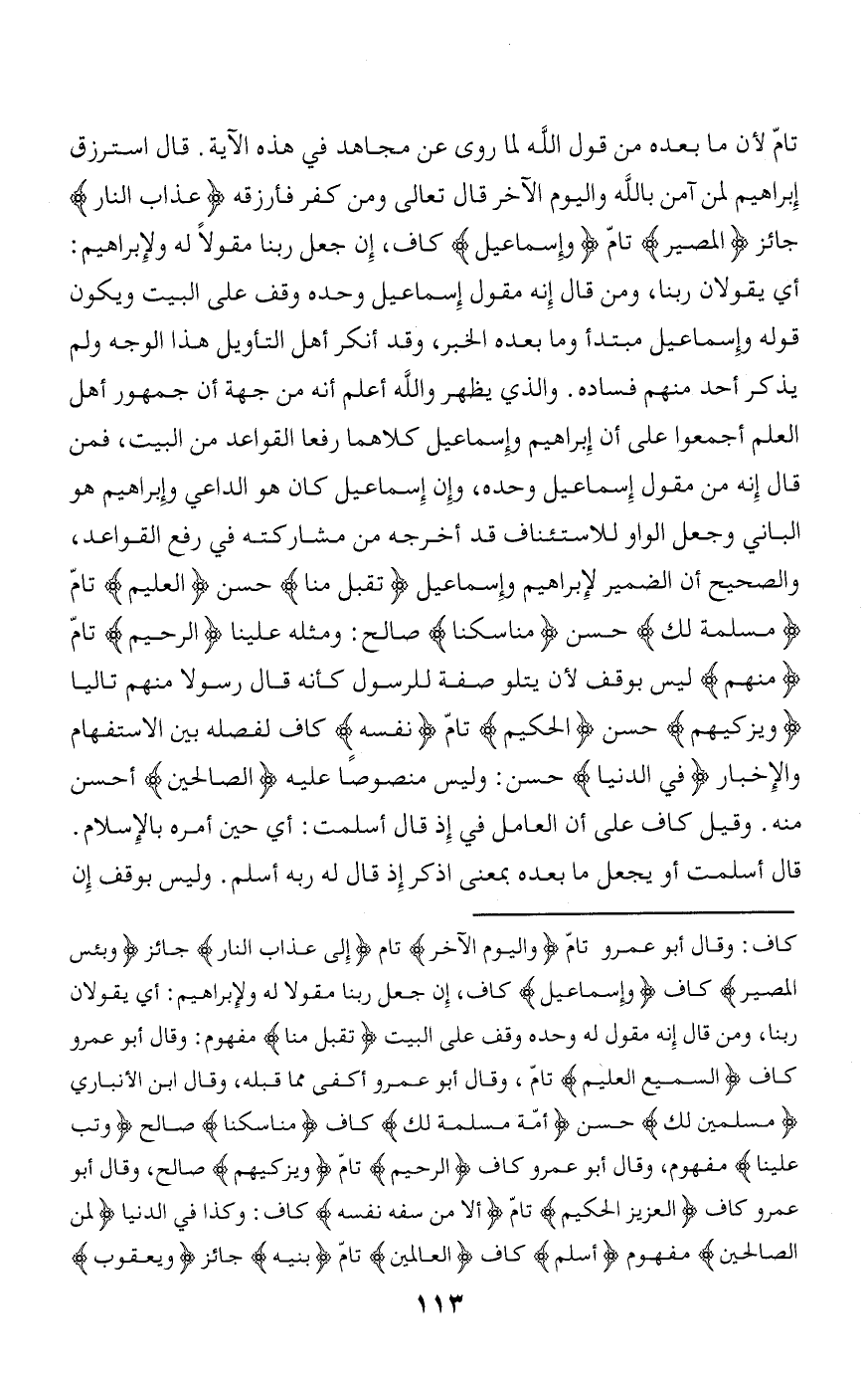 كاف: وقال أبو عمرو تامّ وَالْيَوْمِ الْآخِرِ تام إِلى عَذابِ النَّارِ جائز وَبِئْسَ الْمَصِيرُ كاف وَإِسْماعِيلُ كاف، إن جعل ربنا مقولا له ولإبراهيم: أي يقولان ربنا، ومن قال إنه مقول له وحده وقف على البيت تَقَبَّلْ مِنَّا مفهوم: وقال أبو عمرو كاف السَّمِيعُ الْعَلِيمُ تامّ، وقال أبو عمرو أكفى مما قبله، وقال ابن الأنباري مُسْلِمَيْنِ لَكَ حسن أُمَّةً مُسْلِمَةً لَكَ كاف مَناسِكَنا صالح وَتُبْ عَلَيْنا مفهوم، وقال أبو عمرو كاف الرَّحِيمُ تامّ وَيُزَكِّيهِمْ صالح، وقال أبو عمرو كاف الْعَزِيزُ الْحَكِيمُ تامّ إِلَّا مَنْ سَفِهَ نَفْسَهُ كاف: وكذا في الدنيا لَمِنَ الصَّالِحِينَ مفهوم أَسْلِمْ كاف الْعالَمِينَ تامّ بَنِيهِ جائز وَيَعْقُوبُ