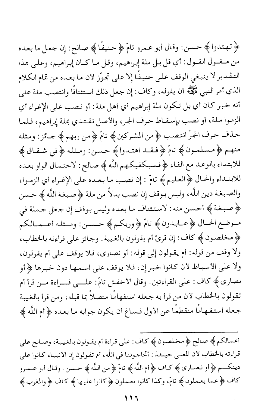 تَهْتَدُوا حسن: وقال أبو عمرو تامّ حَنِيفاً صالح: إن جعل ما بعده من مقول القول: أي قل بل ملة إبراهيم، وقل ما كان إبراهيم، وعلى هذا التقدير لا ينبغي الوقف على حنيفا إلا على تجوّز لأن ما بعده من تمام الكلام الذي أمر النبي صلّى الله عليه وسلّم أن يقوله، وكاف: إن جعل ذلك استئنافا وانتصب ملة على أنه خبر كان أي بل تكون ملة إبراهيم أي أهل ملة: أو نصب على الإغراء أي الزموا ملة، أو نصب بإسقاط حرف الجر، والأصل نقتدي بملة إبراهيم، فلما حذف حرف الجرّ انتصب مِنَ الْمُشْرِكِينَ تامّ مِنْ رَبِّهِمْ جائز: ومثله منهم مُسْلِمُونَ تامّ فَقَدِ اهْتَدَوْا حسن: ومثله فِي شِقاقٍ للابتداء بالوعد مع الفاء فَسَيَكْفِيكَهُمُ اللَّهُ صالح: لاحتمال الواو بعده للابتداء والحال الْعَلِيمُ تامّ: إن نصب ما بعده على الإغراء أي الزموا، والصبغة دين الله، وليس بوقف إن نصب بدلا من ملة صِبْغَةَ اللَّهِ حسن صِبْغَةَ أحسن منه: لاستئناف ما بعده وليس بوقف إن جعل جملة في موضع الحال عابِدُونَ تامّ وَرَبُّكُمْ حسن: ومثله أعمالكم مُخْلِصُونَ كاف: إن قرئ أم يقولون بالغيبة. وجائز على قراءته بالخطاب، ولا وقف من قوله: أم يقولون إلى قوله: أو نصارى، فلا يوقف على أم يقولون، ولا على الأسباط لأن كانوا خبر إن، فلا يوقف على اسمها دون خبرها أَوْ نَصارى كاف: على القراءتين. وقال الأخفش تامّ: على قراءة من قرأ أم تقولون بالخطاب لأن من قرأ به جعله استفهاما متصلا بما قبله، ومن قرأ بالغيبة جعله استفهاما منقطعا عن الأول فساغ أن يكون جوابه ما بعده أَمِ اللَّهُ