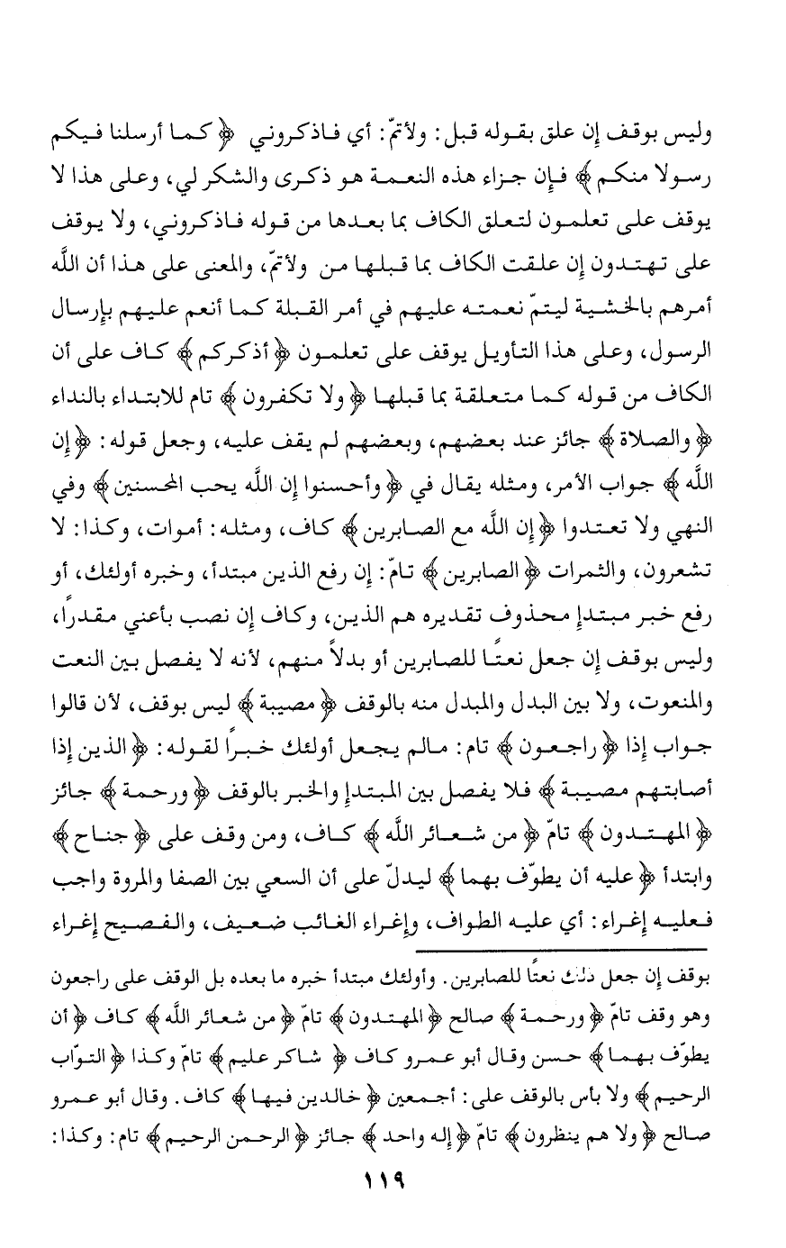 وليس بوقف إن علق بقوله قبل: ولأتمّ: أي فاذكروني كَما أَرْسَلْنا فِيكُمْ رَسُولًا مِنْكُمْ فإن جزاء هذه النعمة هو ذكرى والشكر لي، وعلى هذا لا يوقف على تعلمون لتعلق الكاف بما بعدها من قوله فاذكروني، ولا يوقف على تهتدون إن علقت الكاف بما قبلها من ولأتمّ، والمعنى على هذا أن الله أمرهم بالخشية ليتمّ نعمته عليهم في أمر القبلة كما أنعم عليهم بإرسال الرسول، وعلى هذا التأويل يوقف على تعلمون أَذْكُرْكُمْ كاف على أن الكاف من قوله كما متعلقة بما قبلها وَلا تَكْفُرُونِ تام للابتداء بالنداء وَالصَّلاةِ جائز عند بعضهم، وبعضهم لم يقف عليه، وجعل قوله: إِنَّ اللَّهَ جواب الأمر، ومثله يقال في وَأَحْسِنُوا إِنَّ اللَّهَ يُحِبُّ الْمُحْسِنِينَ وفي النهي ولا تعتدوا إِنَّ اللَّهَ مَعَ الصَّابِرِينَ كاف، ومثله: أموات، وكذا: لا تشعرون، والثمرات الصَّابِرِينَ تامّ: إن رفع الذين مبتدأ، وخبره أولئك، أو رفع خبر مبتدإ محذوف تقديره هم الذين، وكاف إن نصب بأعني مقدرا، وليس بوقف إن جعل نعتا للصابرين أو بدلا منهم، لأنه لا يفصل بين النعت والمنعوت، ولا بين البدل والمبدل منه بالوقف مُصِيبَةٌ ليس بوقف، لأن قالوا جواب إذا راجِعُونَ تام: ما لم يجعل أولئك خبرا لقوله: الَّذِينَ إِذا أَصابَتْهُمْ مُصِيبَةٌ فلا يفصل بين المبتدإ والخبر بالوقف وَرَحْمَةٌ جائز الْمُهْتَدُونَ تامّ مِنْ شَعائِرِ اللَّهِ كاف، ومن وقف على جُناحَ وابتدأ عَلَيْهِ أَنْ يَطَّوَّفَ بِهِما ليدلّ على أن السعي بين الصفا والمروة واجب فعليه إغراء: أي عليه الطواف، وإغراء الغائب ضعيف، والفصيح إغراء
