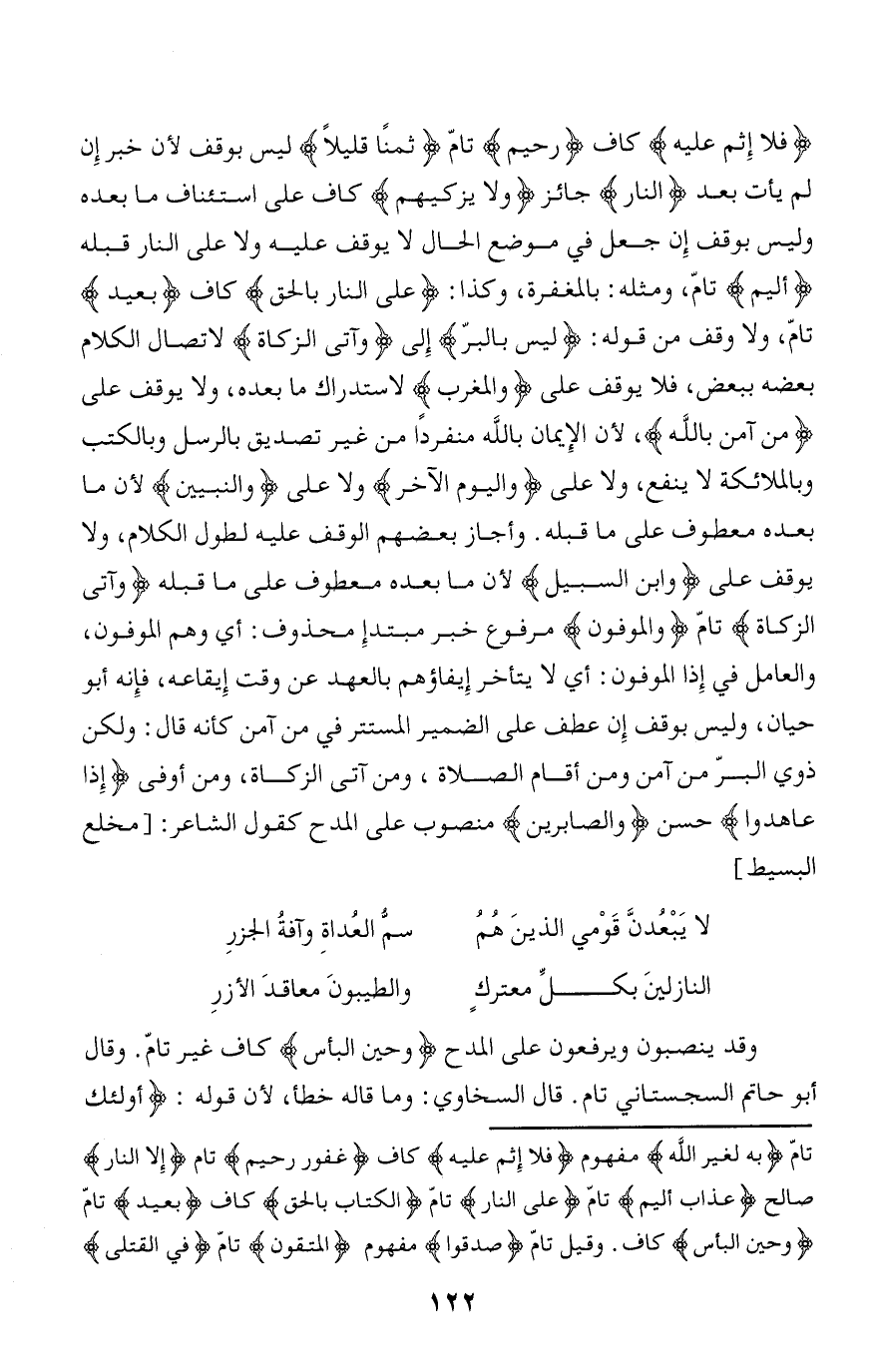 فَلا إِثْمَ عَلَيْهِ كاف رَحِيمٌ تامّ ثَمَناً قَلِيلًا ليس بوقف لأن خبر إن لم يأت بعد النَّارَ جائز وَلا يُزَكِّيهِمْ كاف على استئناف ما بعده وليس بوقف إن جعل في موضع الحال لا يوقف عليه ولا على النار قبله أَلِيمٌ تامّ، ومثله: بالمغفرة، وكذا: عَلَى النَّارِ بِالْحَقِّ كاف بَعِيدٍ تامّ، ولا وقف من قوله: لَيْسَ الْبِرَّ إلى وَآتَى الزَّكاةَ لاتصال الكلام بعضه ببعض، فلا يوقف على وَالْمَغْرِبِ لاستدراك ما بعده، ولا يوقف على مَنْ آمَنَ بِاللَّهِ، لأن الإيمان بالله منفردا من غير تصديق بالرسل وبالكتب وبالملائكة لا ينفع، ولا على وَالْيَوْمِ الْآخِرِ ولا على وَالنَّبِيِّينَ لأن ما بعده معطوف على ما قبله. وأجاز بعضهم الوقف عليه لطول الكلام، ولا يوقف على وَابْنَ السَّبِيلِ لأن ما بعده معطوف على ما قبله وَآتَى الزَّكاةَ تامّ وَالْمُوفُونَ مرفوع خبر مبتدإ محذوف: أي وهم الموفون، والعامل في إذا الموفون: أي لا يتأخر إيفاؤهم بالعهد عن وقت إيقاعه، فإنّه أبو حيان، وليس بوقف إن عطف على الضمير المستتر في من آمن كأنه قال: ولكن ذوي البرّ من آمن ومن أقام الصلاة، ومن آتى الزكاة، ومن أوفى إِذا عاهَدُوا حسن وَالصَّابِرِينَ منصوب على المدح كقول الشاعر: [مخلع البسيط]