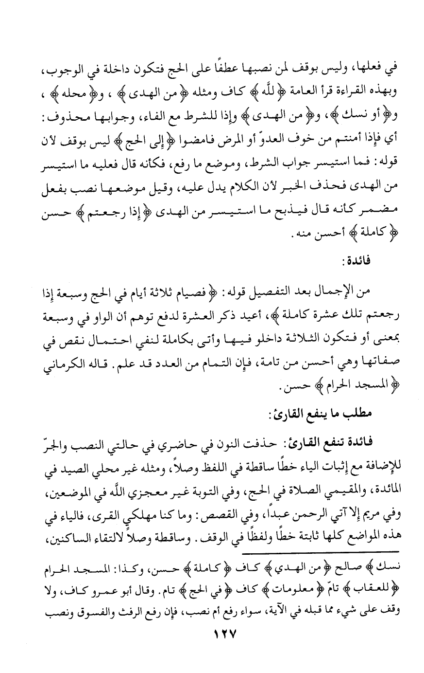 نُسُكٍ صالح مِنَ الْهَدْيِ كاف كامِلَةٌ حسن، وكذا: المسجد الحرام الْعِقابِ تامّ مَعْلُوماتٌ كاف فِي الْحَجِّ تام. وقال أبو عمرو كاف، ولا وقف على شيء مما قبله في الآية، سواء رفع أم نصب، فإن رفع الرفث والفسوق ونصب