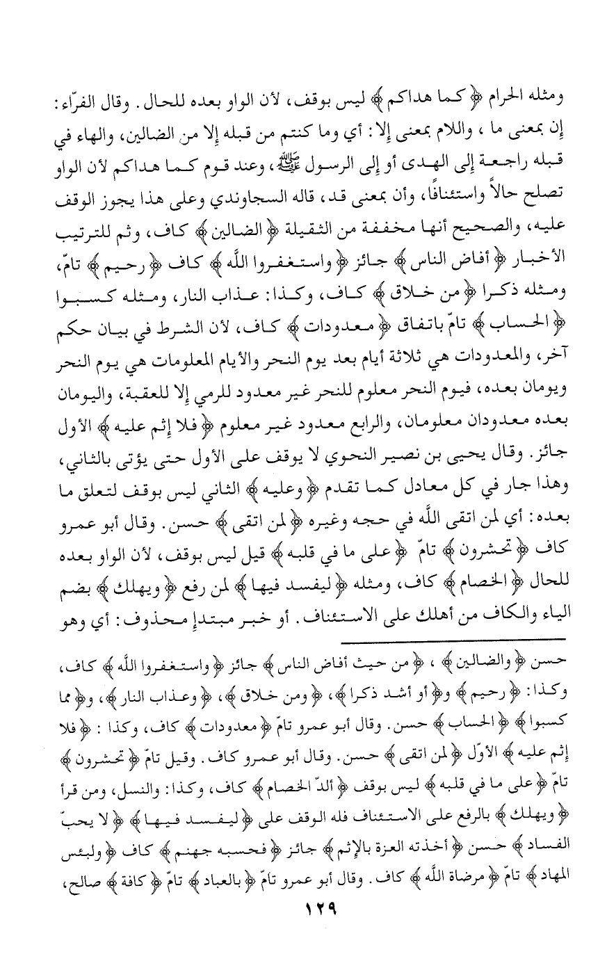 حسن والضَّالِّينَ، مِنْ حَيْثُ أَفاضَ النَّاسُ جائز وَاسْتَغْفِرُوا اللَّهَ كاف، وكذا: رَحِيمٌ وأَوْ أَشَدَّ ذِكْراً، ومِنْ خَلاقٍ، وعَذابَ النَّارِ، ومِمَّا كَسَبُوا الْحِسابِ حسن. وقال أبو عمرو تامّ مَعْدُوداتٍ كاف، وكذا: فَلا إِثْمَ عَلَيْهِ الأوّل لِمَنِ اتَّقى حسن. وقال أبو عمرو كاف. وقيل تامّ تُحْشَرُونَ تامّ عَلى ما فِي قَلْبِهِ ليس بوقف أَلَدُّ الْخِصامِ كاف، وكذا: والنسل، ومن قرأ وَيُهْلِكَ بالرفع على الاستئناف فله الوقف على لِيُفْسِدَ فِيها لا يُحِبُّ الْفَسادَ حسن أَخَذَتْهُ الْعِزَّةُ بِالْإِثْمِ جائز فَحَسْبُهُ جَهَنَّمُ كاف وَلَبِئْسَ الْمِهادُ تامّ مَرْضاتِ اللَّهِ كاف. وقال أبو عمرو تامّ بِالْعِبادِ تامّ كَافَّةً صالح،