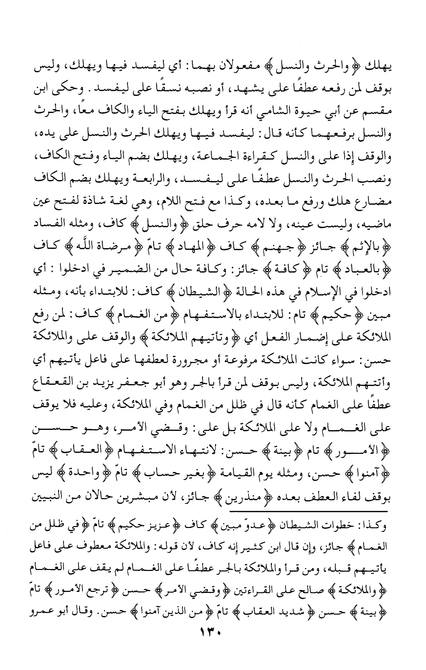 يهلك والْحَرْثَ وَالنَّسْلَ مفعولان بهما: أي ليفسد فيها ويهلك، وليس بوقف لمن رفعه عطفا على يشهد، أو نصبه نسقا على ليفسد. وحكى ابن مقسم عن أبي حيوة الشامي أنه قرأ ويهلك بفتح الياء والكاف معا، والحرث والنسل برفعهما كأنه قال: ليفسد فيها ويهلك الحرث والنسل على يده، والوقف إذا على والنسل كقراءة الجماعة، ويهلك بضم الياء وفتح الكاف، ونصب الحرث والنسل عطفا على ليفسد، والرابعة ويهلك بضم الكاف مضارع هلك ورفع ما بعده، وكذا مع فتح اللام، وهي لغة شاذة لفتح عين ماضيه، وليست عينه، ولا لامه حرف حلق وَالنَّسْلَ كاف، ومثله الفساد بِالْإِثْمِ جائز جَهَنَّمُ كاف الْمِهادُ تامّ مَرْضاتِ اللَّهِ كاف بِالْعِبادِ تام كَافَّةً جائز: وكافة حال من الضمير في ادخلوا: أي ادخلوا في الإسلام في هذه الحالة الشَّيْطانِ كاف: للابتداء بأنه، ومثله مبين حَكِيمٌ تام: للابتداء بالاستفهام مِنَ الْغَمامِ كاف: لمن رفع الملائكة على إضمار الفعل أي وتأتيهم الْمَلائِكَةُ والوقف على والملائكة حسن: سواء كانت الملائكة مرفوعة أو مجرورة لعطفها على فاعل يأتيهم أي وأتتهم الملائكة، وليس بوقف لمن قرأ بالجر وهو أبو جعفر يزيد بن القعقاع عطفا على الغمام كأنه قال في ظلل من الغمام وفي الملائكة، وعليه فلا يوقف على الغمام ولا على الملائكة بل على: وقضي الأمر، وهو حسن الْأُمُورُ تام بَيِّنَةٍ حسن: لانتهاء الاستفهام الْعِقابِ تامّ آمَنُوا حسن، ومثله يوم القيامة بِغَيْرِ حِسابٍ تامّ واحِدَةً ليس بوقف لفاء العطف بعده مُنْذِرِينَ جائز، لأن مبشرين حالان من النبيين