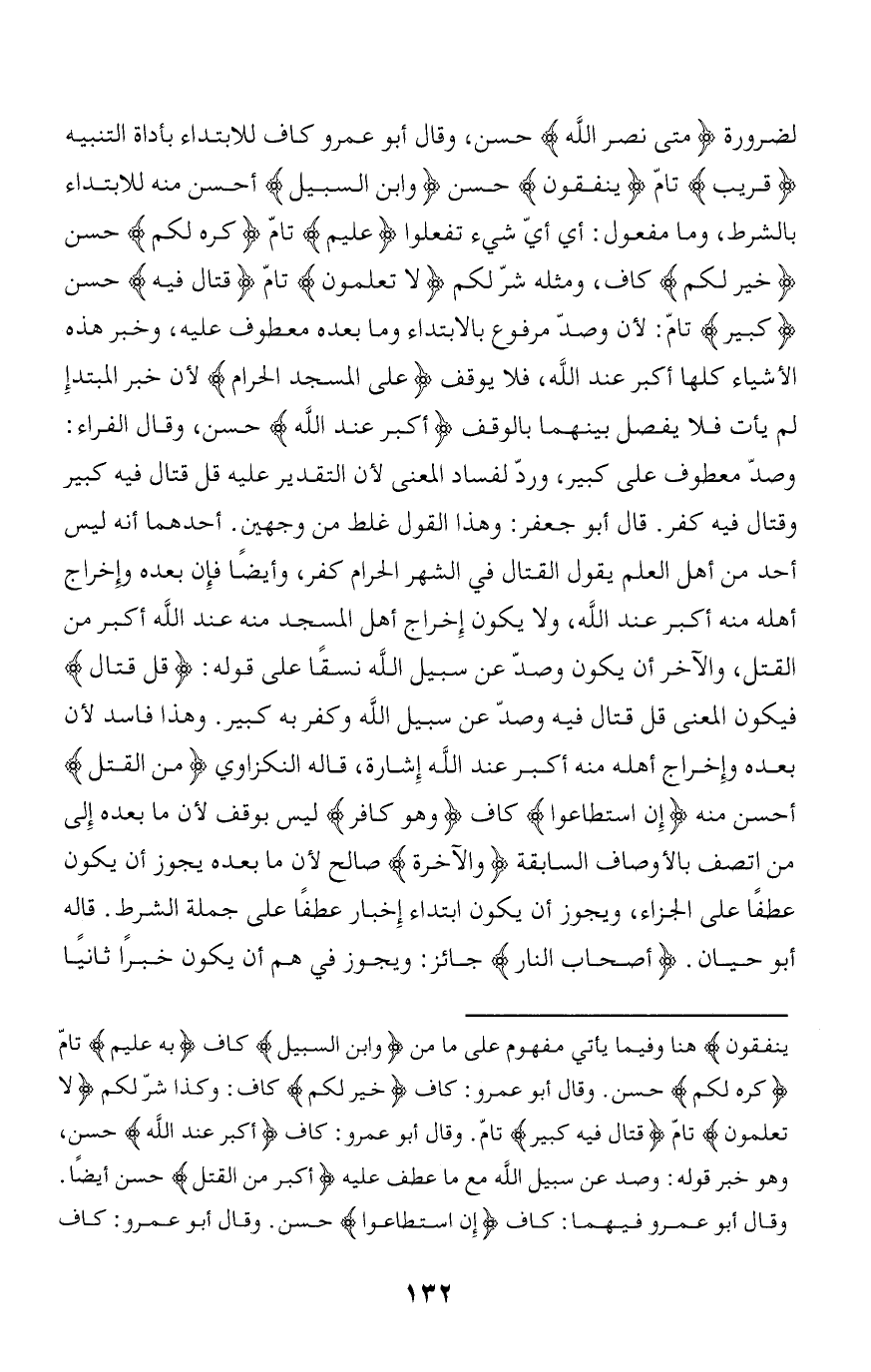 لضرورة مَتى نَصْرُ اللَّهِ حسن، وقال أبو عمرو كاف للابتداء بأداة التنبيه قَرِيبٌ تامّ يُنْفِقُونَ حسن وَابْنِ السَّبِيلِ أحسن منه للابتداء بالشرط، وما مفعول: أي أيّ شيء تفعلوا عَلِيمٌ تامّ كُرْهٌ لَكُمْ حسن خَيْرٌ لَكُمْ كاف، ومثله شرّ لكم لا تَعْلَمُونَ تامّ قِتالٍ فِيهِ حسن كَبِيرٌ تامّ: لأن وصدّ مرفوع بالابتداء وما بعده معطوف عليه، وخبر هذه الأشياء كلها أكبر عند الله، فلا يوقف على الْمَسْجِدِ الْحَرامِ لأن خبر المبتدإ لم يأت فلا يفصل بينهما بالوقف أَكْبَرُ عِنْدَ اللَّهِ حسن، وقال الفراء: