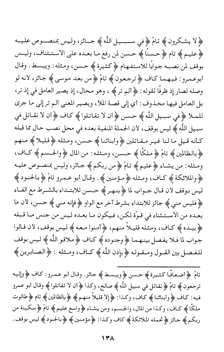 لا يَشْكُرُونَ تامّ فِي سَبِيلِ اللَّهِ جائز، وليس بمنصوص عليه عَلِيمٌ تام حَسَناً حسن لمن رفع ما بعده على الاستئناف، وليس بوقف لمن نصبه جوابا للاستفهام كَثِيرَةً حسن، ومثله: ويبسط. وقال أبو عمرو: فيهما كاف تُرْجَعُونَ تامّ مِنْ بَعْدِ مُوسى جائز، لأنه لو وصله لصار إذ ظرفا لقوله: أَلَمْ تَرَ، وهو محال، إذ يصير العامل في إذ تر، بل العامل فيها محذوف: أي إلى قصة الملأ، ويصير المعنى ألم تر إلى ما جرى للملإ فِي سَبِيلِ اللَّهِ حسن أَلَّا تُقاتِلُوا كاف أَلَّا نُقاتِلَ فِي سَبِيلِ اللَّهِ ليس بوقف، لأن الجملة المنفية بعده في محل نصب حال مما قبله كأنه قيل ما لنا غير مقاتلين وَأَبْنائِنا حسن، ومثله قَلِيلًا منهم بِالظَّالِمِينَ تامّ مَلِكاً حسن، ومثله: من المال وَالْجِسْمِ كاف، ومثله: من يشاء عَلِيمٌ تامّ مِنْ رَبِّكُمْ جائز، وليس بمنصوص عليه والْمَلائِكَةُ كاف، ومثله مُؤْمِنِينَ. وقال أبو عمرو تامّ بِالْجُنُودِ ليس بوقف لأن قال جواب لما بِنَهَرٍ حسن للابتداء بالشرط مع الفاء فَلَيْسَ مِنِّي جائز للابتداء بشرط آخر مع الواو فَإِنَّهُ مِنِّي حسن، لأن ما بعده من الاستثناء في قوّة لكن، فيكون ما بعده ليس من جنس ما قبله بِيَدِهِ كاف، ومثله قليلا منهم، آمَنُوا مَعَهُ ليس بوقف، لأن قالوا جواب لما فلا يفصل بينهما وَجُنُودِهِ كاف مُلاقُوا اللَّهِ ليس بوقف للفصل بين القول ومقوله بِإِذْنِ اللَّهِ كاف، ومثله: الصَّابِرِينَ