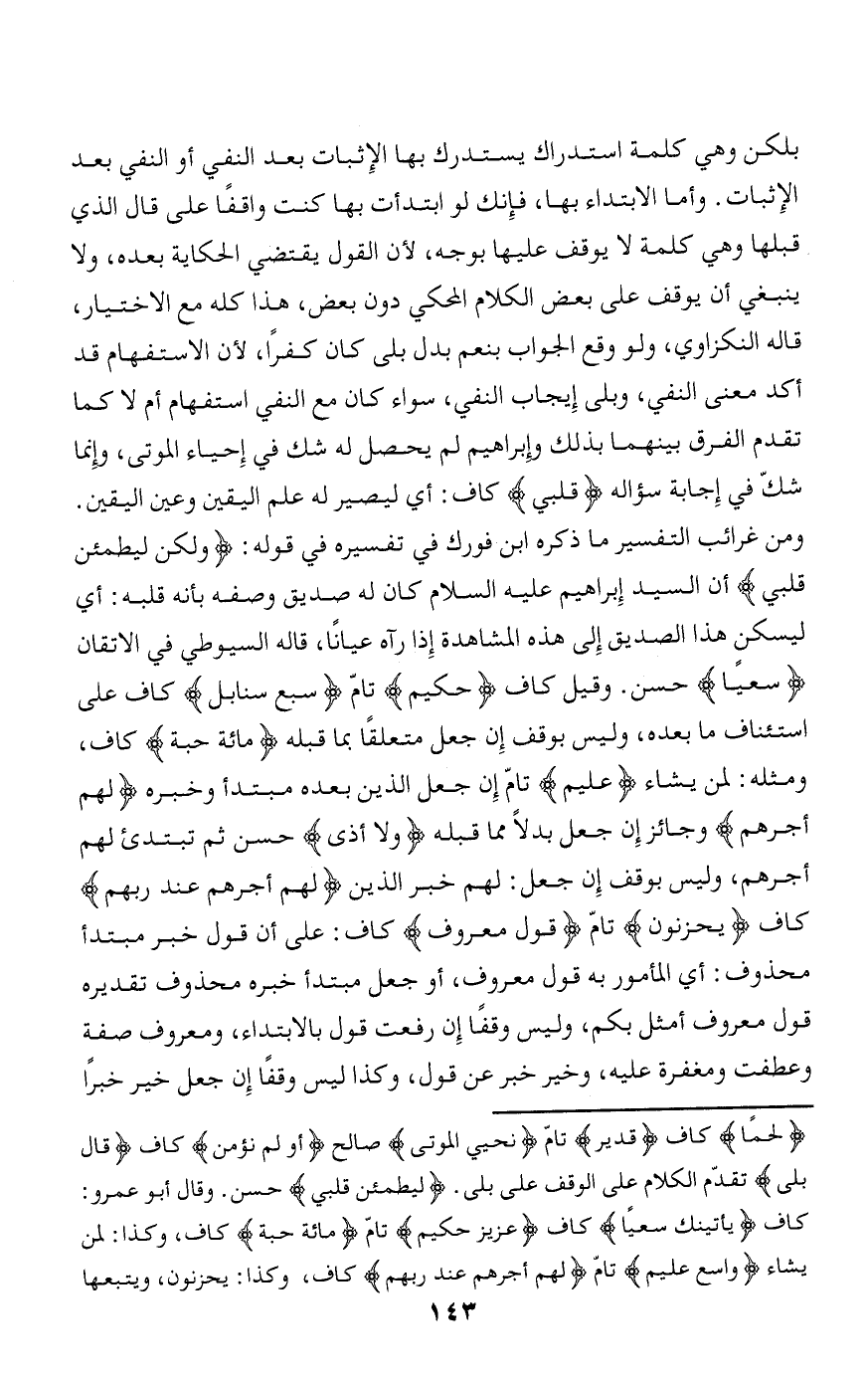 ومن غرائب التفسير ما ذكره ابن فورك في تفسيره في قوله: وَلكِنْ لِيَطْمَئِنَّ قَلْبِي أن السيد إبراهيم عليه السلام كان له صديق وصفه بأنه قلبه: أي ليسكن هذا الصديق إلى هذه المشاهدة إذا رآه عيانا، قاله السيوطي في الاتقان سَعْياً حسن. وقيل كاف حَكِيمٌ تامّ سَبْعَ سَنابِلَ كاف على استئناف ما بعده، وليس بوقف إن جعل متعلقا بما قبله مِائَةُ حَبَّةٍ كاف، ومثله: لمن يشاء عَلِيمٌ تامّ إن جعل الذين بعده مبتدأ وخبره لَهُمْ أَجْرُهُمْ وجائز إن جعل بدلا مما قبله وَلا أَذىً حسن ثم تبتدئ لهم أجرهم، وليس بوقف إن جعل: لهم خبر الذين لَهُمْ أَجْرُهُمْ عِنْدَ رَبِّهِمْ كاف يَحْزَنُونَ تامّ قَوْلٌ مَعْرُوفٌ كاف: على أن قول خبر مبتدأ محذوف: أي المأمور به قول معروف، أو جعل مبتدأ خبره محذوف تقديره قول معروف أمثل بكم، وليس وقفا إن رفعت قول بالابتداء، ومعروف صفة وعطفت ومغفرة عليه، وخير خبر عن قول، وكذا ليس وقفا إن جعل خير خبرا
