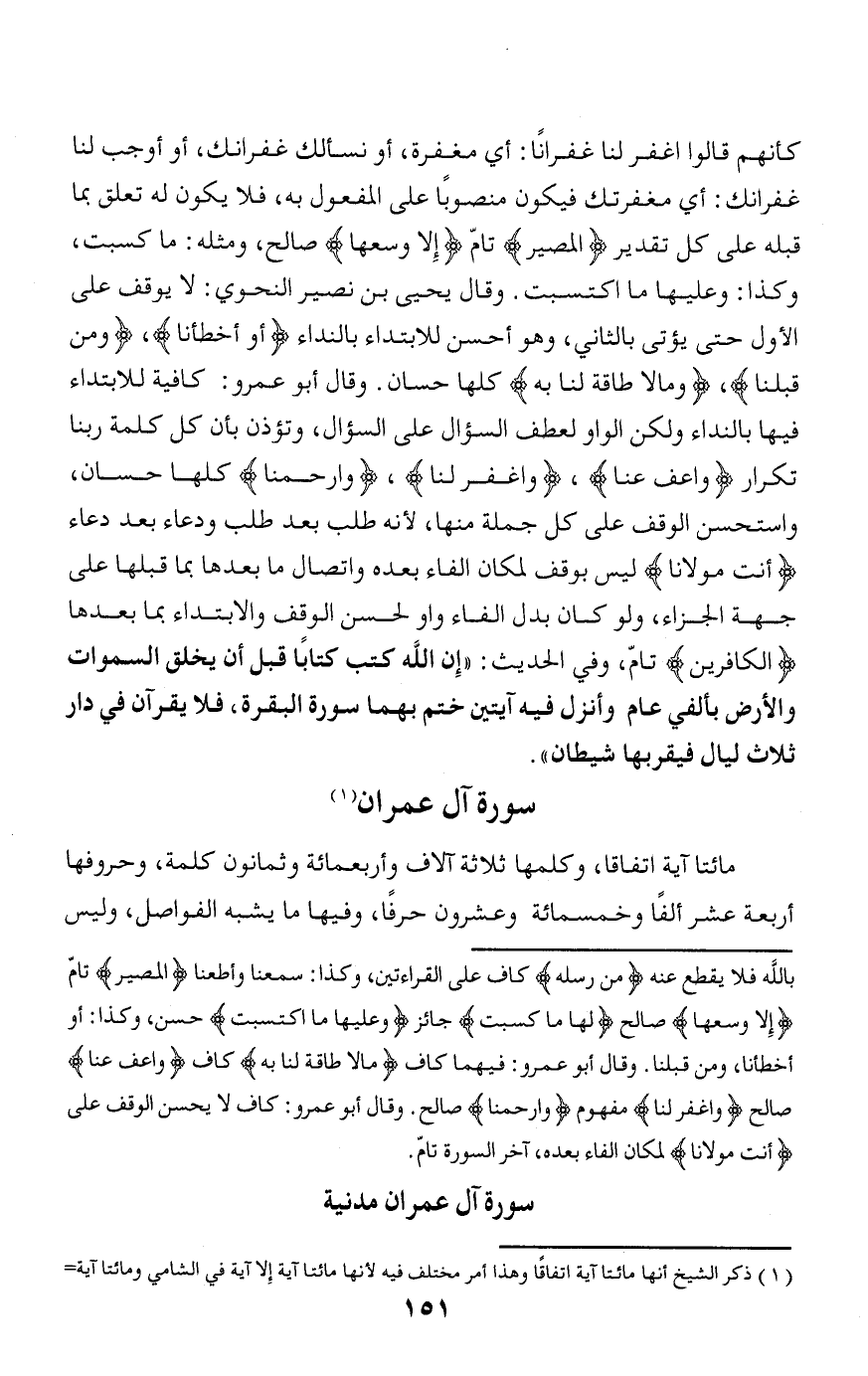 تامّ إِلَّا وُسْعَها صالح، ومثله: ما كسبت، وكذا: وعليها ما اكتسبت. وقال يحيى بن نصير النحوي: لا يوقف على الأول حتى يؤتى بالثاني، وهو أحسن للابتداء بالنداء أَوْ أَخْطَأْنا، ومِنْ قَبْلِنا، وما لا طاقَةَ لَنا بِهِ كلها حسان. وقال أبو عمرو: كافية للابتداء فيها بالنداء ولكن الواو لعطف السؤال على السؤال، وتؤذن بأن كل كلمة ربنا تكرار وَاعْفُ عَنَّا، وَاغْفِرْ لَنا، وَارْحَمْنا كلها حسان، واستحسن الوقف على كل جملة منها، لأنه طلب بعد طلب ودعاء بعد دعاء أَنْتَ مَوْلانا ليس بوقف لمكان الفاء بعده واتصال ما بعدها بما قبلها على جهة الجزاء، ولو كان بدل الفاء واو لحسن الوقف والابتداء بما بعدها الْكافِرِينَ تامّ، وفي الحديث: «إن الله كتب كتابا قبل أن يخلق السموات والأرض بألفي عام وأنزل فيه آيتين ختم بهما سورة البقرة، فلا يقرءان في دار ثلاث ليال فيقربها شيطان».