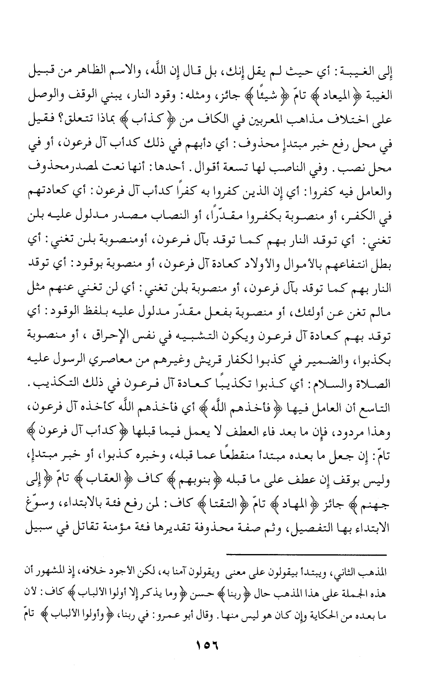 التاسع أن العامل فيها فَأَخَذَهُمُ اللَّهُ أي فأخذهم الله كأخذه آل فرعون، وهذا مردود، فإن ما بعد فاء العطف لا يعمل فيما قبلها كَدَأْبِ آلِ فِرْعَوْنَ تامّ: إن جعل ما بعده مبتدأ منقطعا عما قبله، وخبره كذبوا، أو خبر مبتدإ، وليس بوقف إن عطف على ما قبله بِذُنُوبِهِمْ كاف الْعِقابِ تامّ إِلى جَهَنَّمَ جائز الْمِهادُ تامّ الْتَقَتا كاف: لمن رفع فئة بالابتداء، وسوّغ الابتداء بها التفصيل، وثم صفة محذوفة تقديرها فئة مؤمنة تقاتل في سبيل