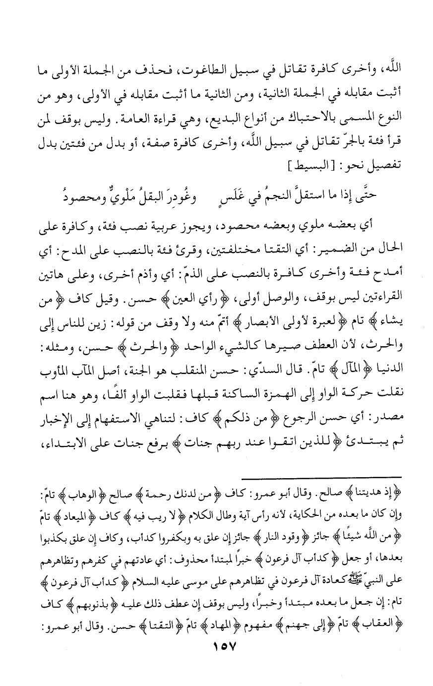 الله، وأخرى كافرة تقاتل في سبيل الطاغوت، فحذف من الجملة الأولى ما أثبت مقابله في الجملة الثانية، ومن الثانية ما أثبت مقابله في الأولى، وهو من النوع المسمى بالاحتباك من أنواع البديع، وهي قراءة العامة. وليس بوقف لمن قرأ فئة بالجرّ تقاتل في سبيل الله، وأخرى كافرة صفة، أو بدل من فئتين بدل تفصيل نحو: [البسيط]