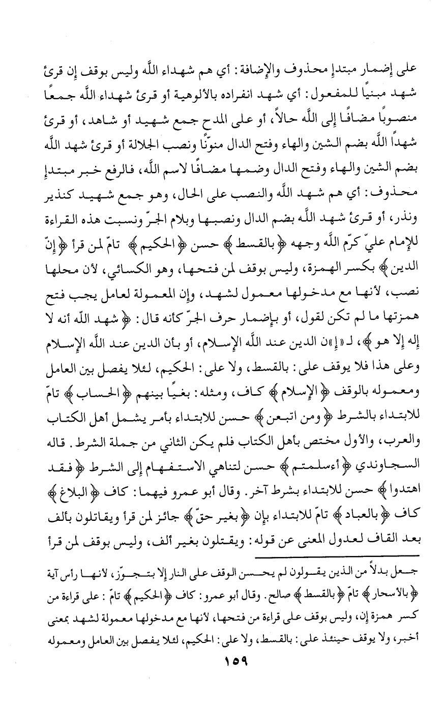 الله حالا، أو على المدح جمع شهيد أو شاهد، أو قرئ شهدا الله بضم الشين والهاء وفتح الدال منوّنا ونصب الجلالة أو قرئ شهد الله بضم الشين والهاء وفتح الدال وضمها مضافا لاسم الله، فالرفع خبر مبتدإ محذوف: أي هم شهد الله والنصب على الحال، وهو جمع شهيد كنذير ونذر، أو قرئ شهد الله بضم الدال ونصبها وبلام الجرّ ونسبت هذه القراءة للإمام عليّ كرّم الله وجهه بِالْقِسْطِ حسن الْحَكِيمُ تامّ لمن قرأ إِنَّ الدِّينَ بكسر الهمزة، وليس بوقف لمن فتحها، وهو الكسائي، لأن محلها نصب، لأنها مع مدخولها معمول لشهد، وإن المعمولة لعامل يجب فتح همزتها ما لم تكن لقول، أو بإضمار حرف الجرّ كأنه قال: شَهِدَ اللَّهُ أَنَّهُ لا إِلهَ إِلَّا هُوَ، ل «إ» ن الدين عند الله الإسلام، أو بأن الدين عند الله الإسلام وعلى هذا فلا يوقف على: بالقسط، ولا على: الحكيم، لئلا يفصل بين العامل ومعموله بالوقف الْإِسْلامُ كاف، ومثله: بغيا بينهم الْحِسابِ تامّ للابتداء بالشرط وَمَنِ اتَّبَعَنِ حسن للابتداء بأمر يشمل أهل الكتاب والعرب، والأول مختص بأهل الكتاب فلم يكن الثاني من جملة الشرط. قاله السجاوندي أَأَسْلَمْتُمْ حسن لتناهي الاستفهام إلى الشرط فَقَدِ اهْتَدَوْا حسن للابتداء بشرط آخر. وقال أبو عمرو فيهما: كاف الْبَلاغُ كاف بِالْعِبادِ تامّ للابتداء بإن بِغَيْرِ حَقٍّ جائز لمن قرأ ويقاتلون بألف بعد القاف لعدول المعنى عن قوله: ويقتلون بغير ألف، وليس بوقف لمن قرأ