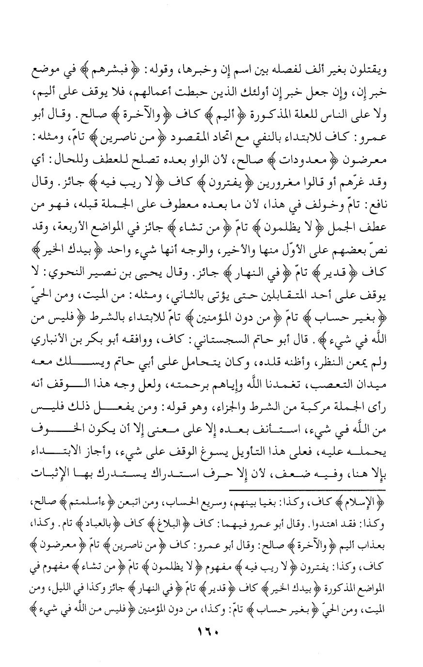 الْإِسْلامُ كاف، وكذا: بغيا بينهم، وسريع الحساب، ومن اتبعن أَأَسْلَمْتُمْ صالح، وكذا: فقد اهتدوا. وقال أبو عمرو فيهما: كاف الْبَلاغُ كاف بِالْعِبادِ تام. وكذا، بعذاب أليم وَالْآخِرَةِ صالح: وقال أبو عمرو: كاف مِنْ ناصِرِينَ تامّ مُعْرِضُونَ كاف، وكذا: يفترون لا رَيْبَ فِيهِ مفهوم لا يُظْلَمُونَ تامّ مَنْ تَشاءُ مفهوم في المواضع المذكورة بِيَدِكَ الْخَيْرُ كاف قَدِيرٌ تامّ فِي النَّهارِ جائز وكذا في الليل، ومن الميت، ومن الحيّ بِغَيْرِ حِسابٍ تامّ: وكذا، من دون المؤمنين فَلَيْسَ مِنَ اللَّهِ فِي شَيْءٍ